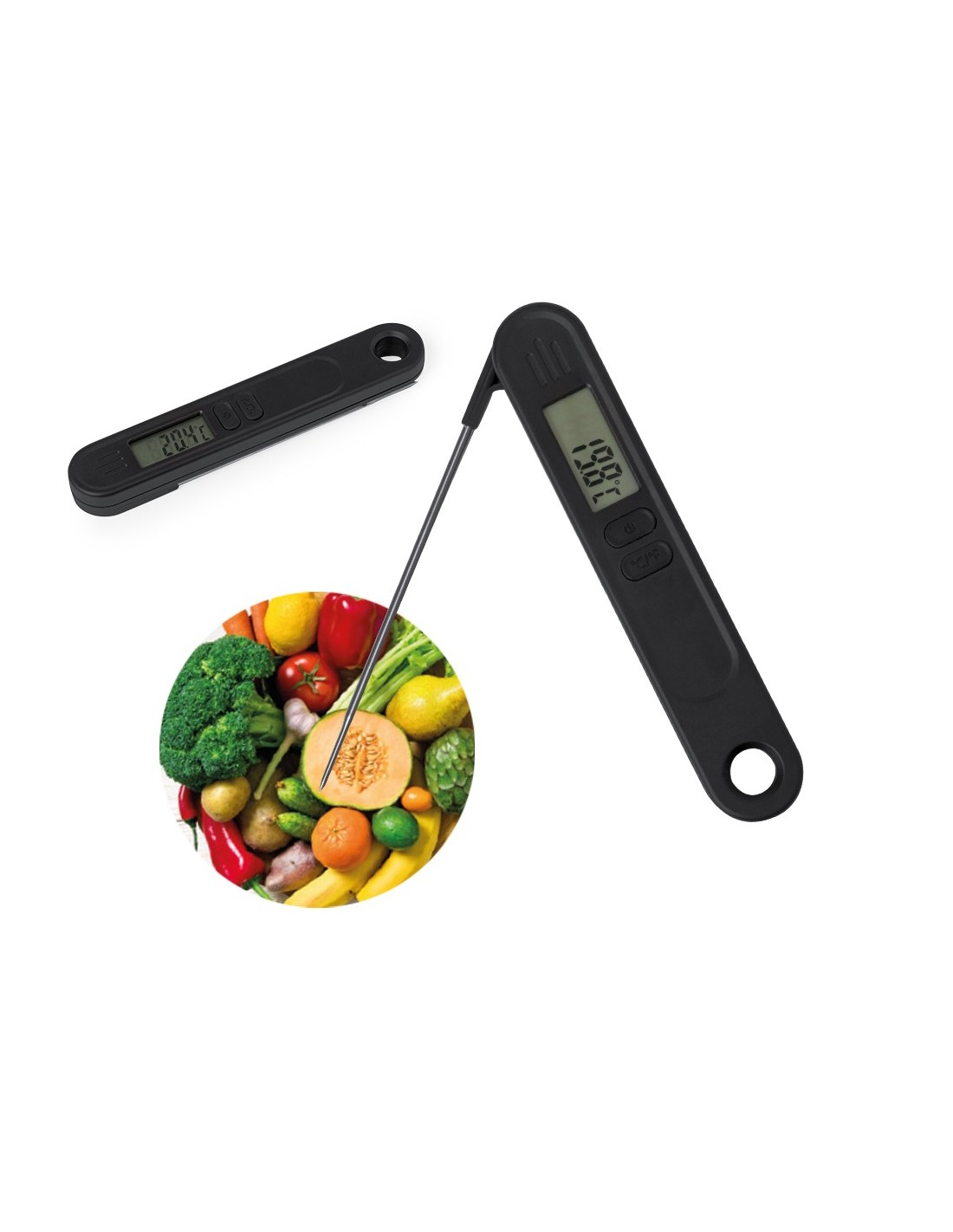 Termómetro digital con sonda metálica. Óptimo para la medición de temperatura en el interior de los objetos gracias a su punzón metálico. Práctico mecanismo de plegado para guardarlo de forma segura en cualquier sitio, con anilla e imán en la parte trasera. Pantalla LCD, con botón ON/OFF y posibilidad de medir en grados centígrados (Cº) o Fahrenheit (ºF). Rango de medición entre -50ºC y hasta 300ºC, con manual de instrucciones en español e inglés. Alimentado por pila de botón (incluida) y presentado individualmente en caja de diseño kraft.