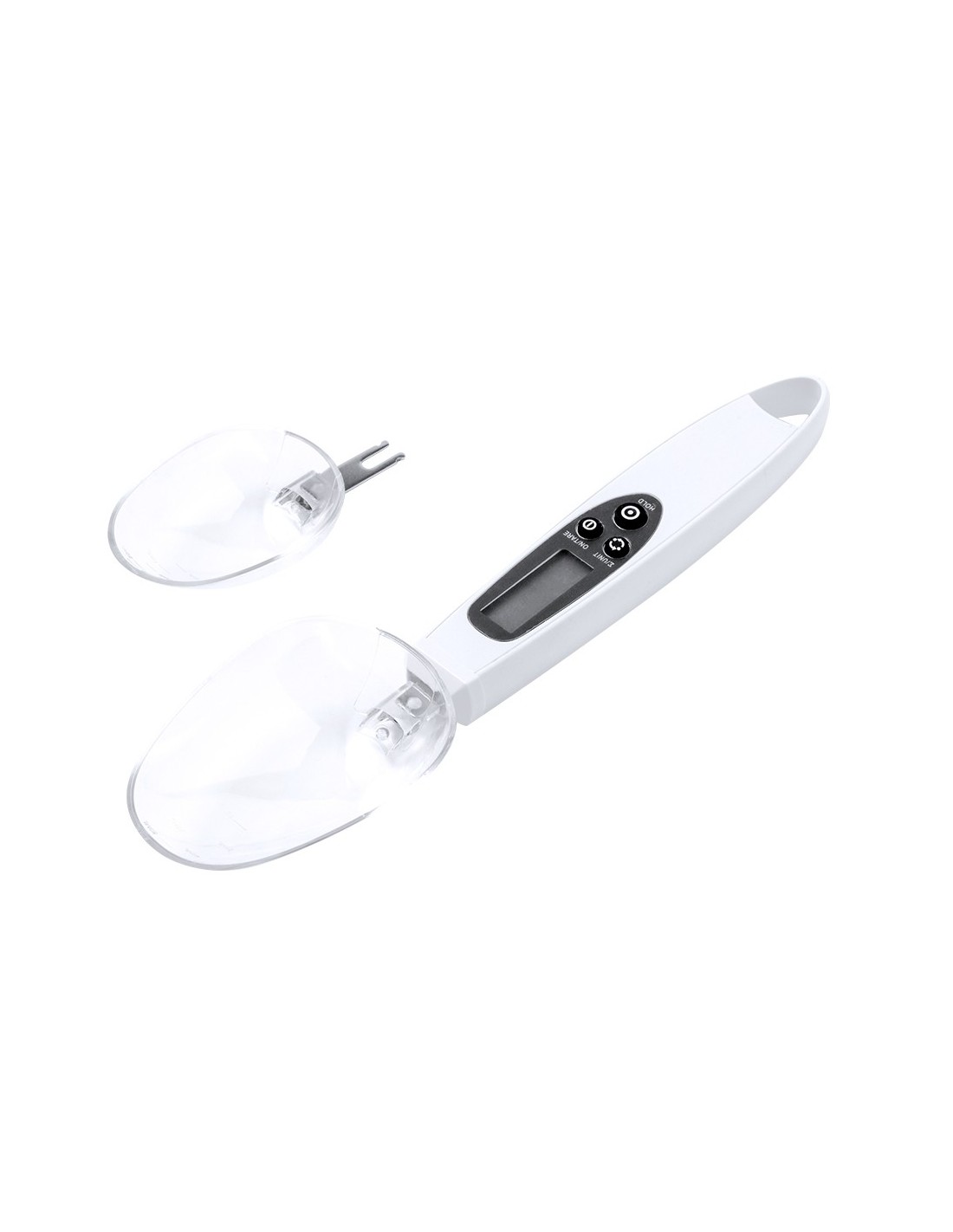 Práctica báscula digital con cuchara, válida para líquidos y sólidos. Incluye 2 cucharas intercambiables y pantalla digital LCD situada en el mango, mostrando el pesaje con una precisión de 0,1g. Botón para mostrar el peso en gramos (g), onzas (oz), o mililitros ( ml), con función de memoria y posibilidad de pesar dos ingredientes. Ambas cucharas llevan grabada una escala de medición adicional para líquidos: la cuchara pequeña desde 5 ml hasta 25 ml; y la cuchara grande desde 10 ml hasta 50 ml. Con manual de instrucciones en español e inglés. Alimentada por pila de botón (incluida) y presentada individualmente en caja de diseño kraft.
