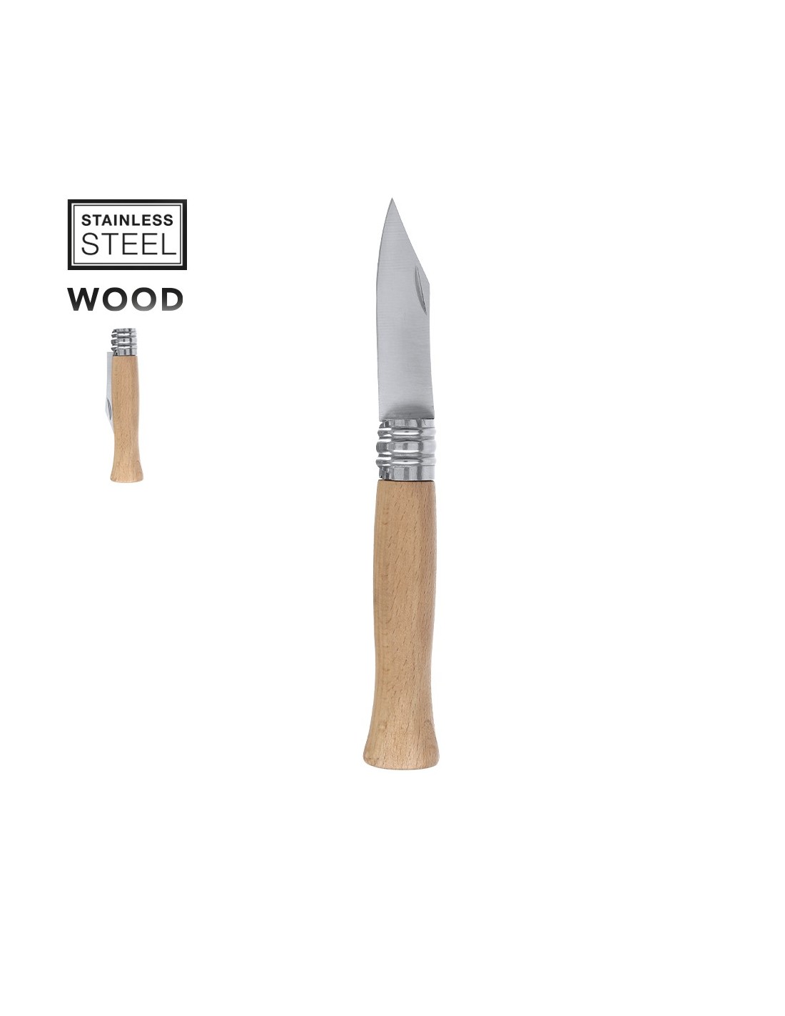 Navaja fabricada en resistente acero inox, con mango ergonómico fabricado en madera natural lacada y con anilla metálica de bloqueo. La aleación de la hoja garantiza resistencia a la corrosión y abrasión, siendo ideal para el uso frecuente con materiales duros. La hoja es de Tipo Clip, que se caracteriza por su forma puntiaguda y destaca por su versatilidad a la hora de usarla. Presentada individualmente en caja blanca.