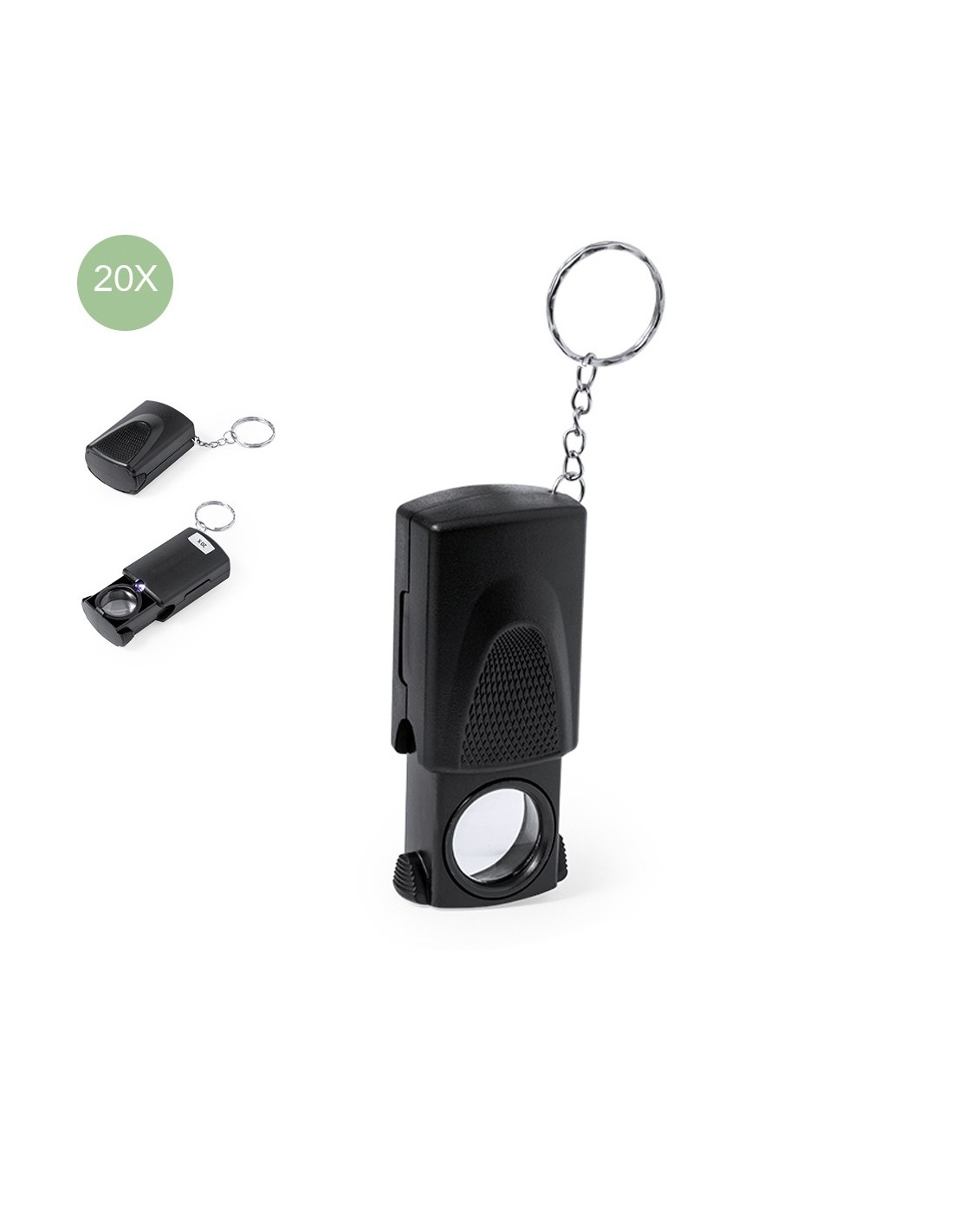 Práctica lupa llavero con aumento 20x y luz LED integrada. Fabricada en resistente ABS de color negro y fácil de transportar por su reducido tamaño. Alimentada por 1 pila de botón (incluida) y presentada en caja individual de cartón negra.