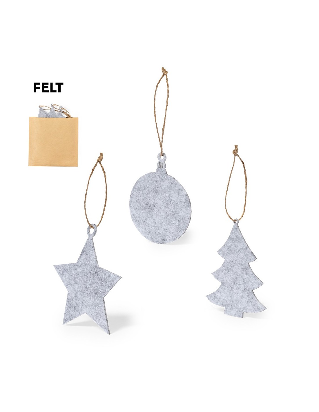 Set de adornos navideños de 3 piezas fabricadas en suave fieltro. Incluye en 3 diseños: Árbol de Navidad, Estrella y Bola Navideña. Todas las piezas incluyen colgador. Presentado en bolsa de papel reciclado.