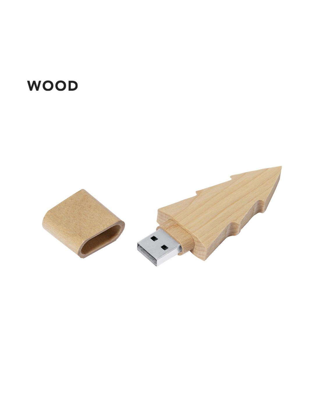 Memoria USB de 16GB de capacidad fabricada en suave madera. Distintivo diseño de pino con cierre de capucha.Elaborado con elementos vegetales para fomentar así la utilización de materias primas naturales y reducir las emisiones contaminantes.