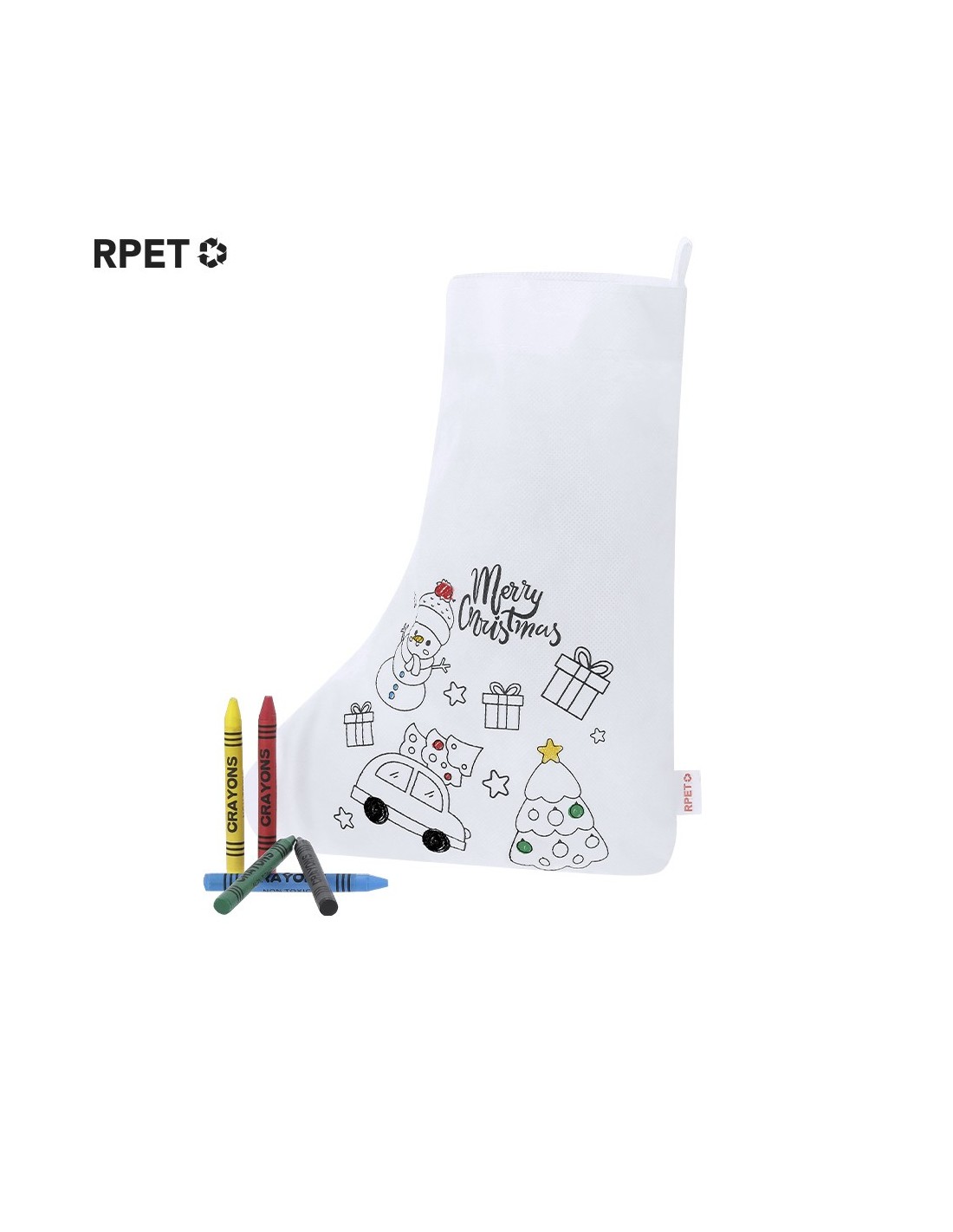 Calcetín de non-woven RPET en color blanco, especialmente diseñado para colorear con ceras. Diseño frontal de divertidos dibujos navideños, incluyendo 5 ceras en variados colores. Con cinta para colgar y de acabado termosellado. Incluye distintivo RPET en etiqueta.El material RPET se elabora a partir de plástico reciclado, para así fomentar la reutilización de residuos plásticos y ayudar a la sostenibilidad del planeta.