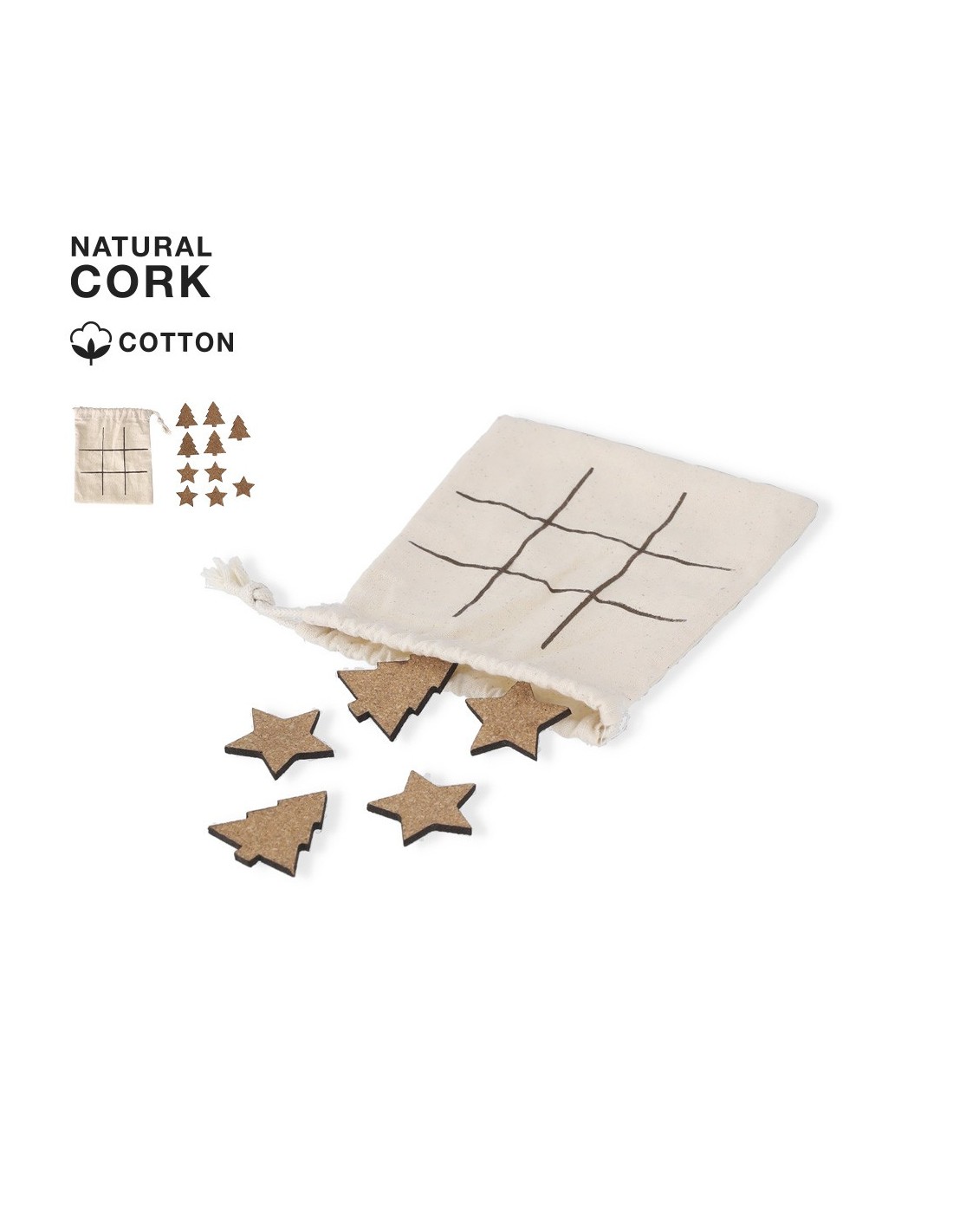 Juego de tres en raya fabricado en corcho natural. Incluye 5 fichas con forma de árbol y 5 fichas con forma de estrella. Presentado en bolsa de algodón con cierre de cordón, facilitando su almacenamiento y convirtiéndose en tablero de juego.Elaborado con elementos vegetales para así fomentar la utilización de materias primas naturales y reducir las emisiones contaminantes.