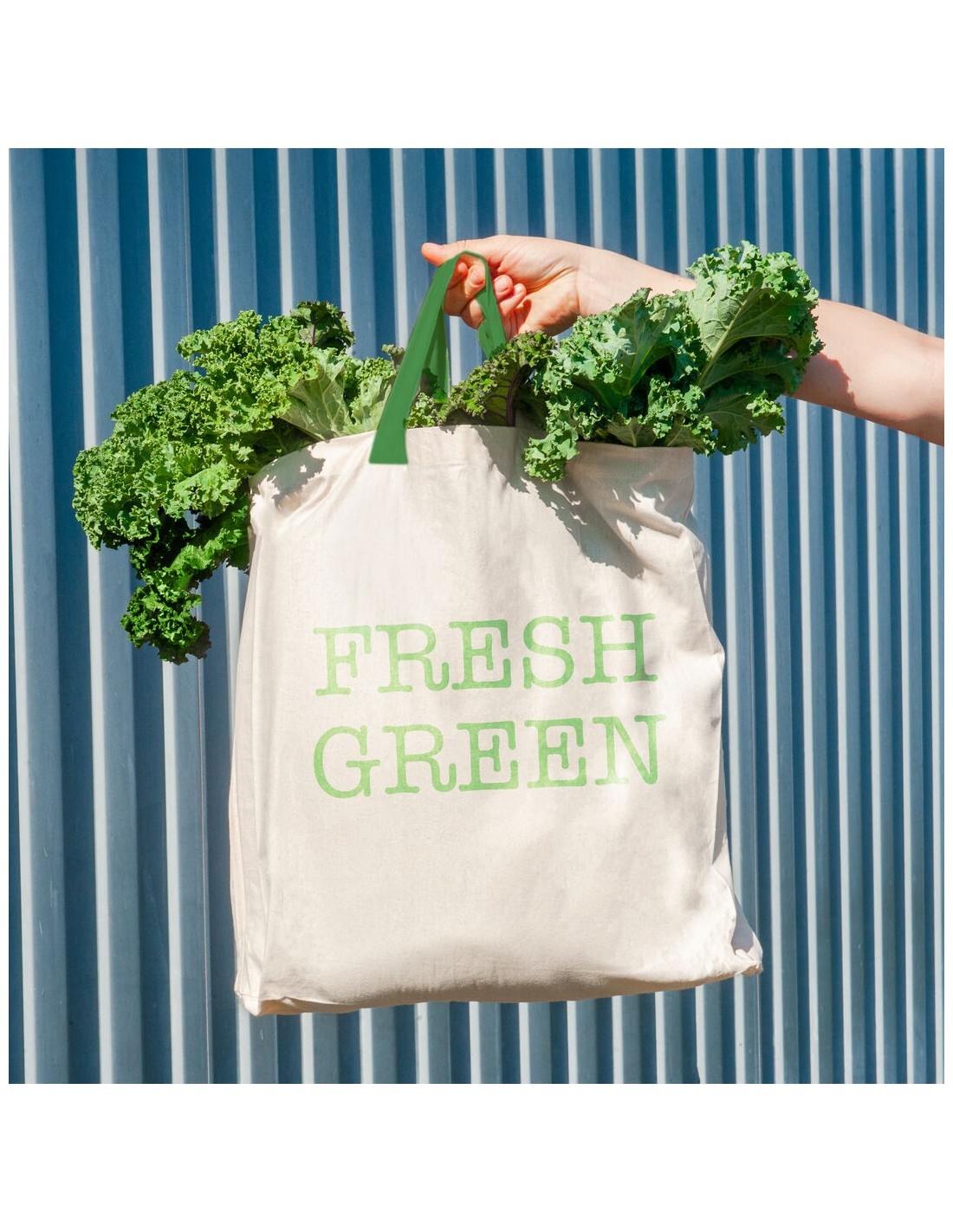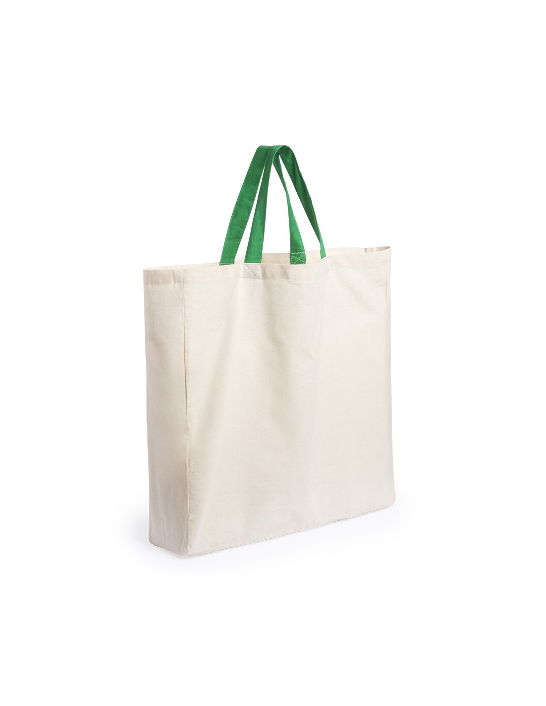 Bolsa en material 100% algodón orgánico con acabado en color natural. Con asas cortas reforzadas de 35cm en color verde, fuelle y acabado cosido. Resistencia hasta 9kg de peso.