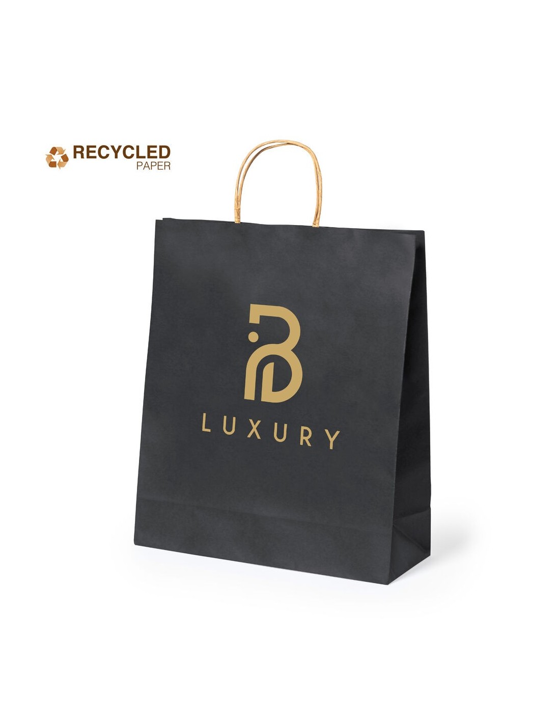 Bolsa de línea nature, fabricada en papel reciclado acabado en negro de 100g/m2, con asas cortas reforzadas en tono natural y fuelle. Resistencia hasta 8 kg de peso.