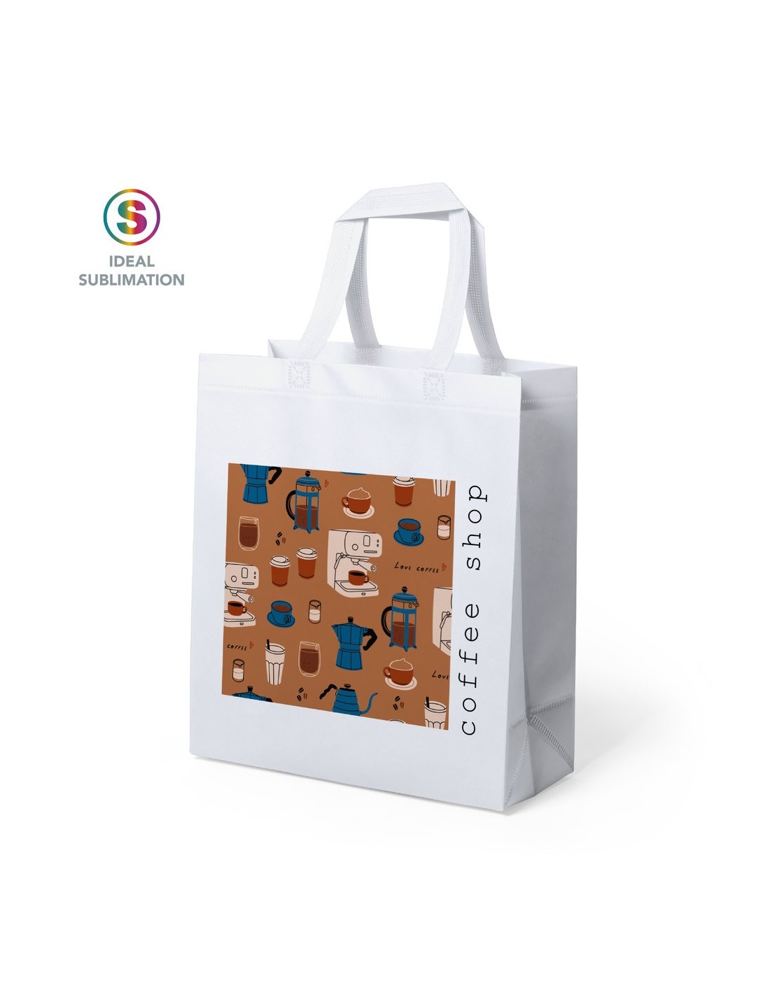 Bolsa en non-woven de 70g/m2, en color blanco y especialmente diseñada para marcaje en sublimación. De acabado termosellado, con fuelle y asas cortas reforzadas (35 x 2,5 cm). Resistencia hasta 8 kg de peso.
