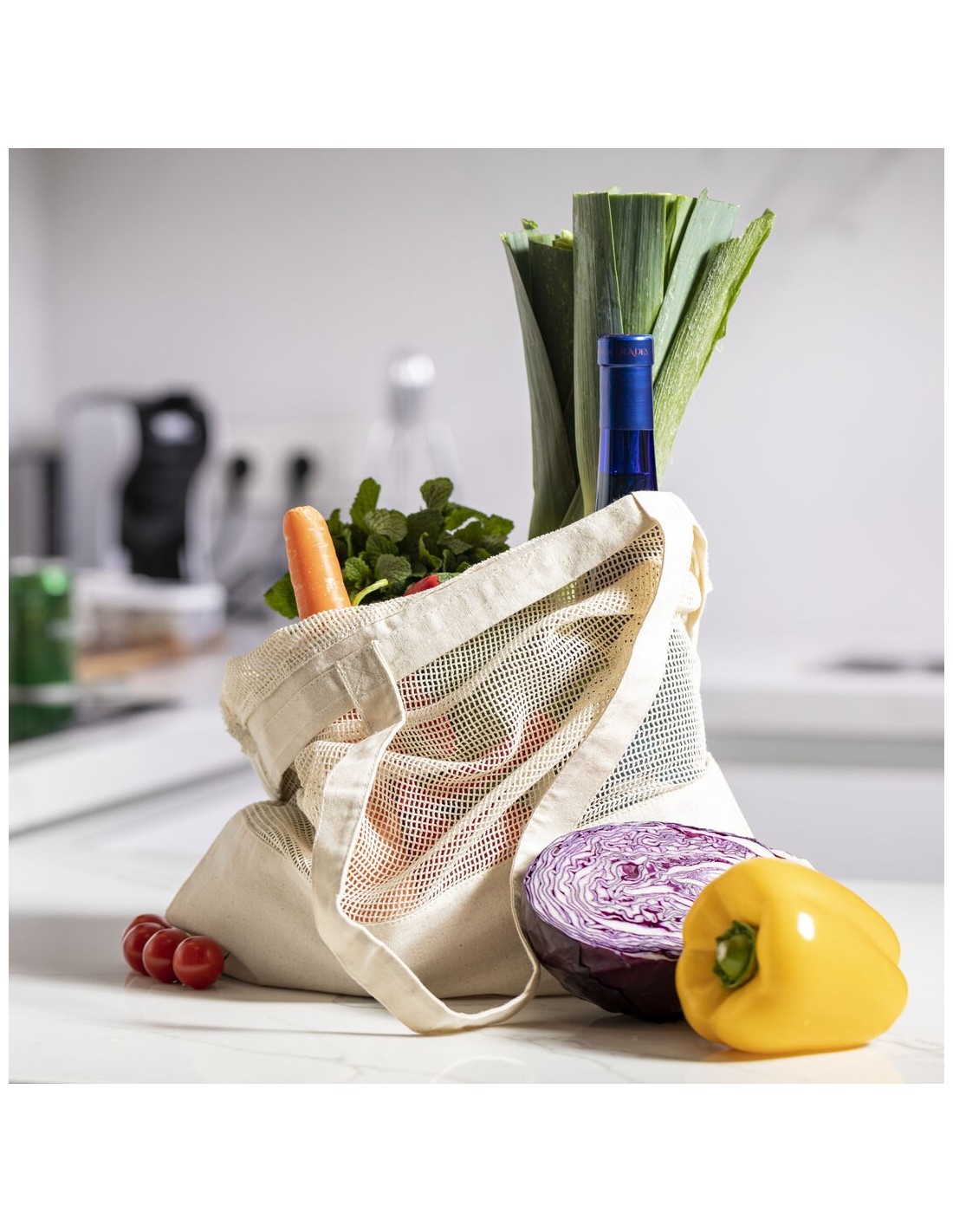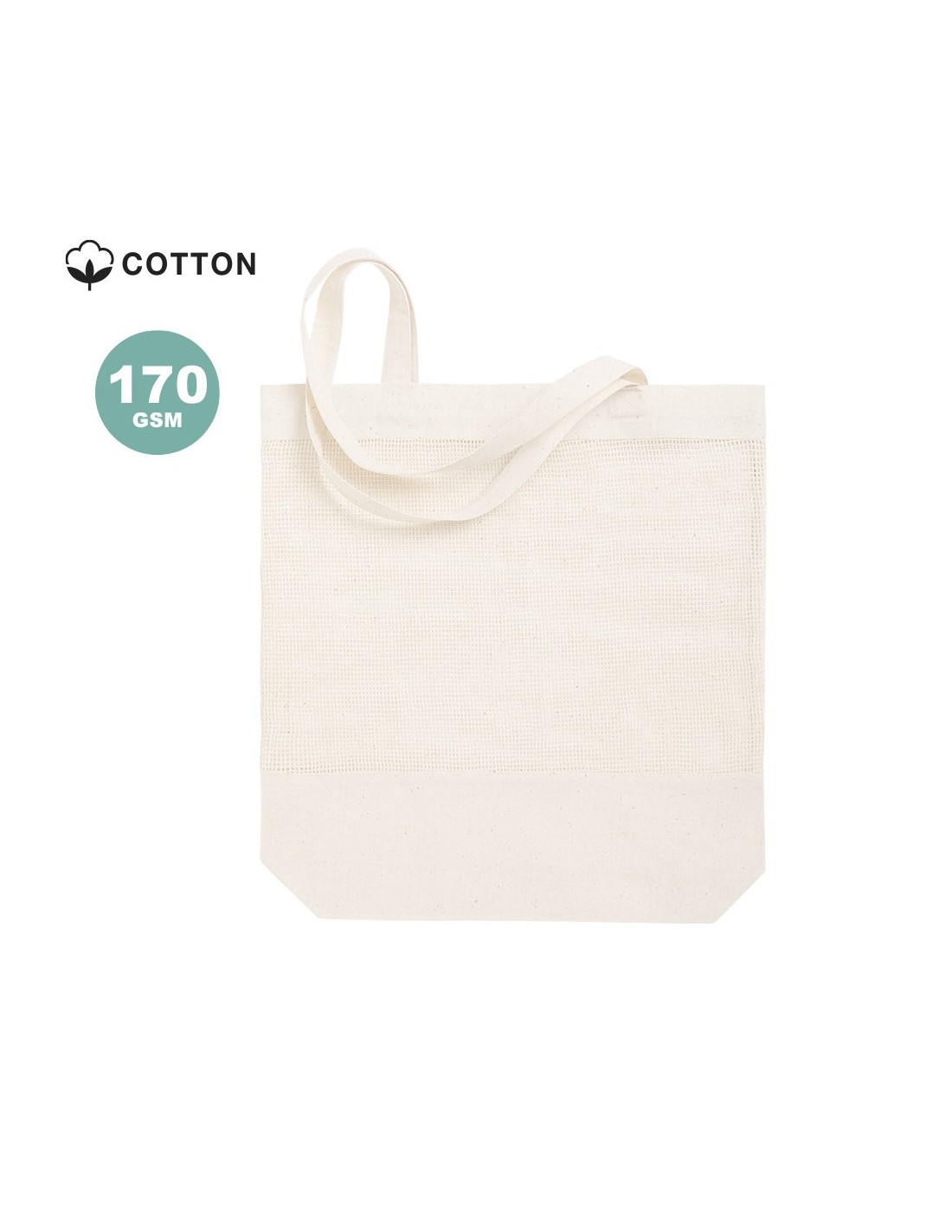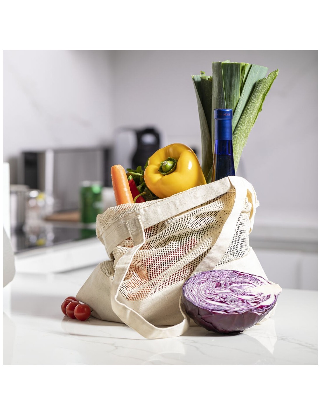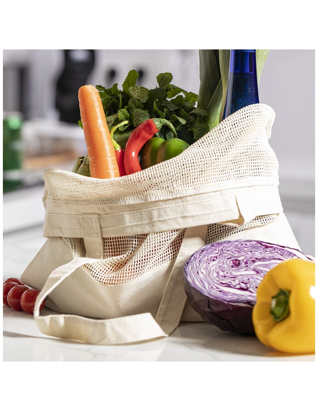 Bolsa de línea nature en resistente algodón de 170g/m2 y original acabado de rejilla. Asas largas en algodón, de 60 cm y reforzadas. Acabado cosido y resistencia hasta 8kg de peso.