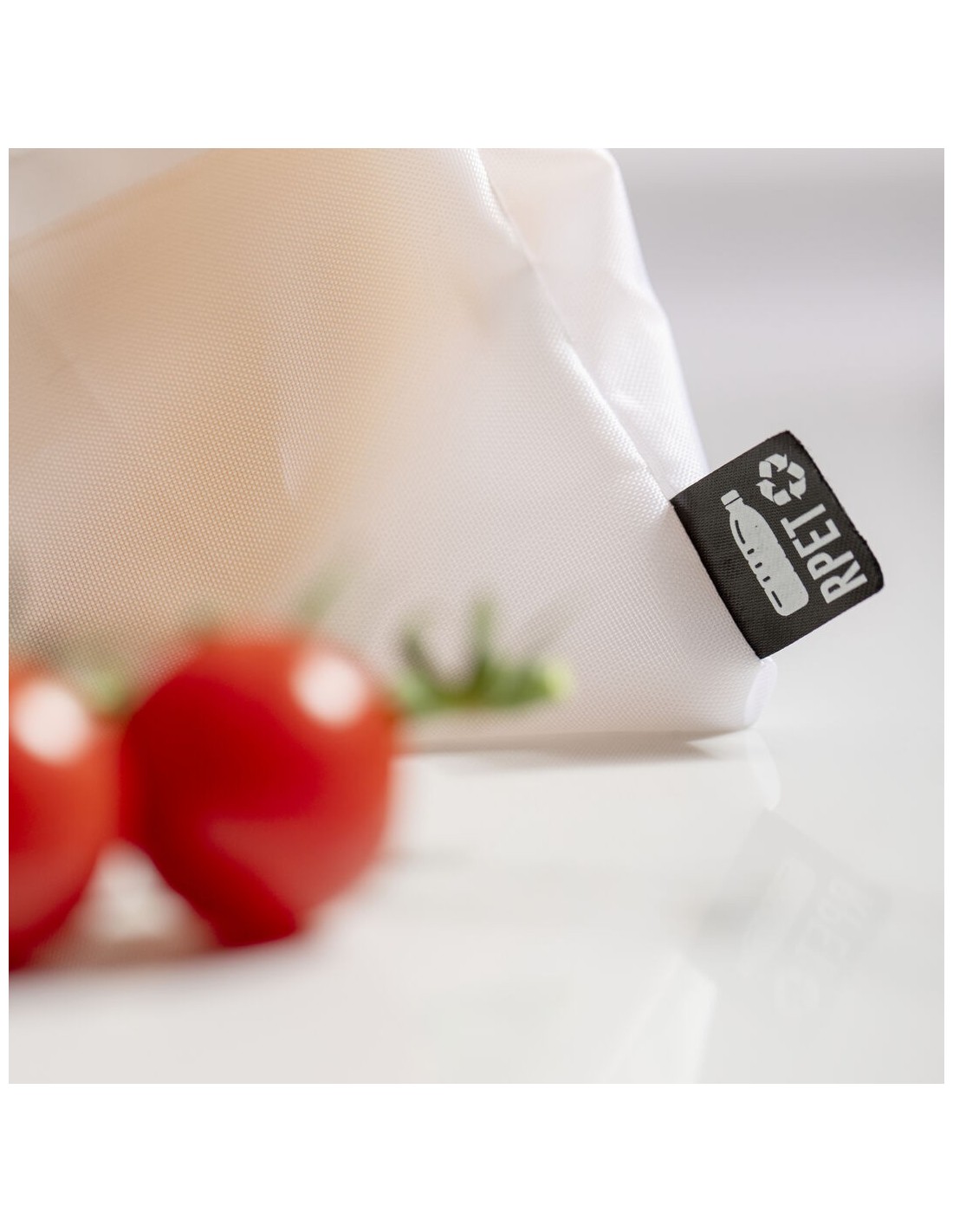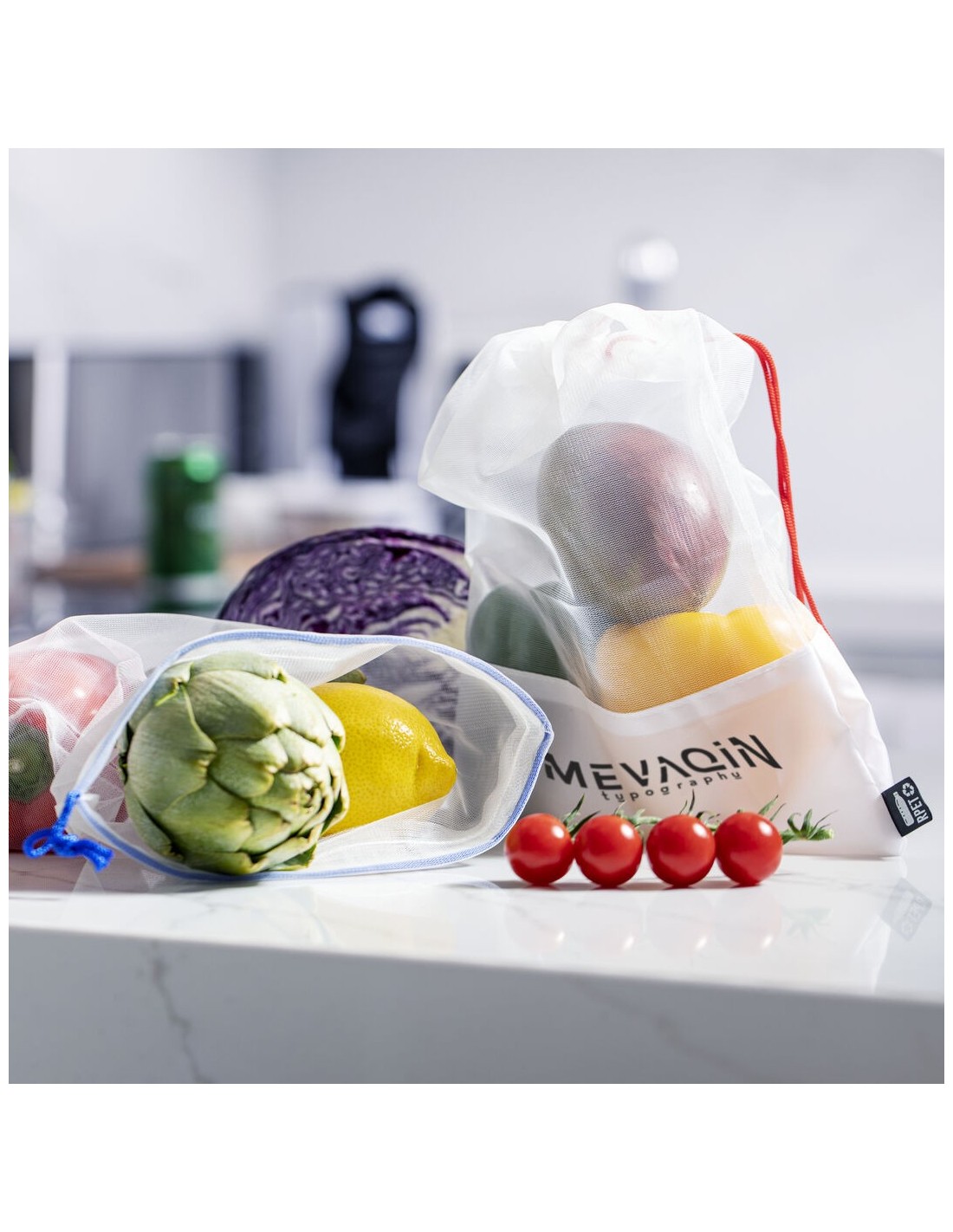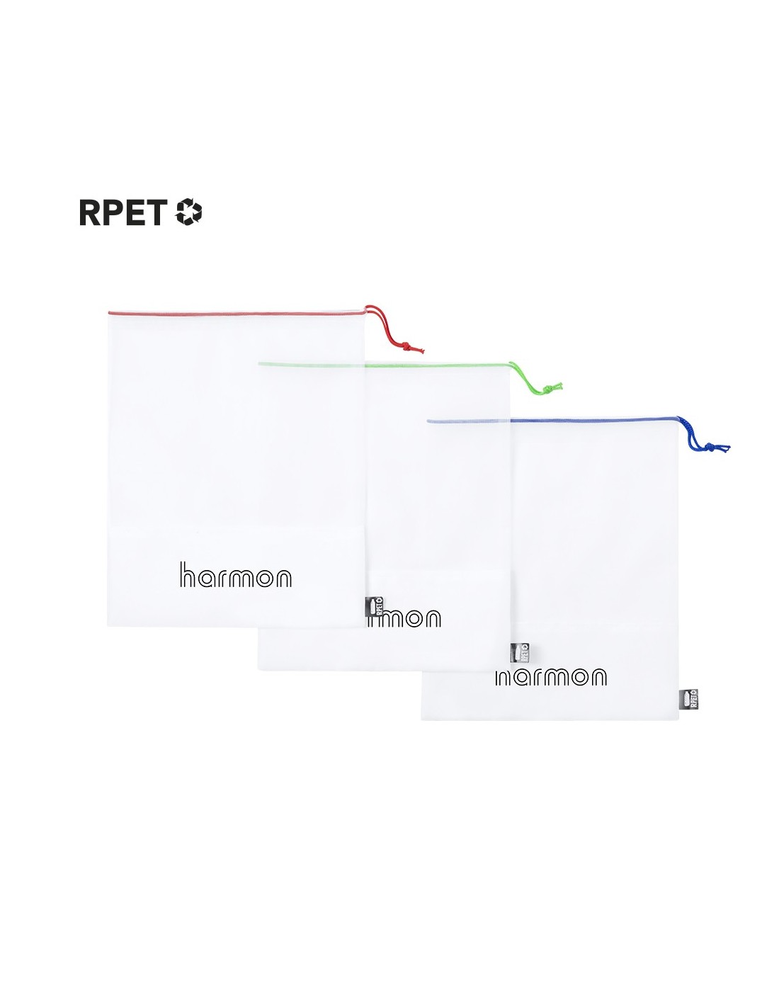 Set de bolsas de línea nature y en resistente RPET, elaborado a partir de plástico reciclado para así fomentar la reutilización de residuos plásticos y contribuir a la sostenibilidad del planeta. Incluye 3 piezas de 25x30 cm con cierre de cordón a color y distintivo RPET en etiqueta exterior. Con amplia zona de marcaje en ambas caras de las bolsas.