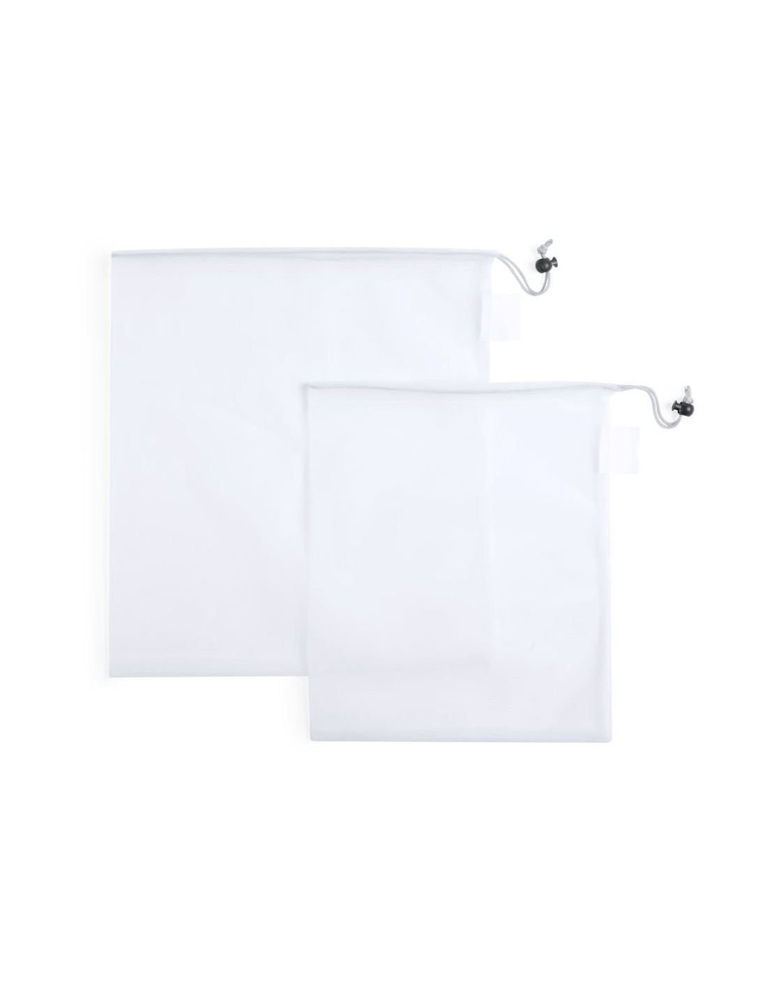 Set de bolsas reutilizables de línea nature. Fabricadas en poliéster de acabado redecilla, con cordón de cierre y accesorio de ajuste. Incluye 2 bolsas (1 bolsa 30x35 cm, 1 bolsa 25x30 cm) con etiqueta lateral personalizable.