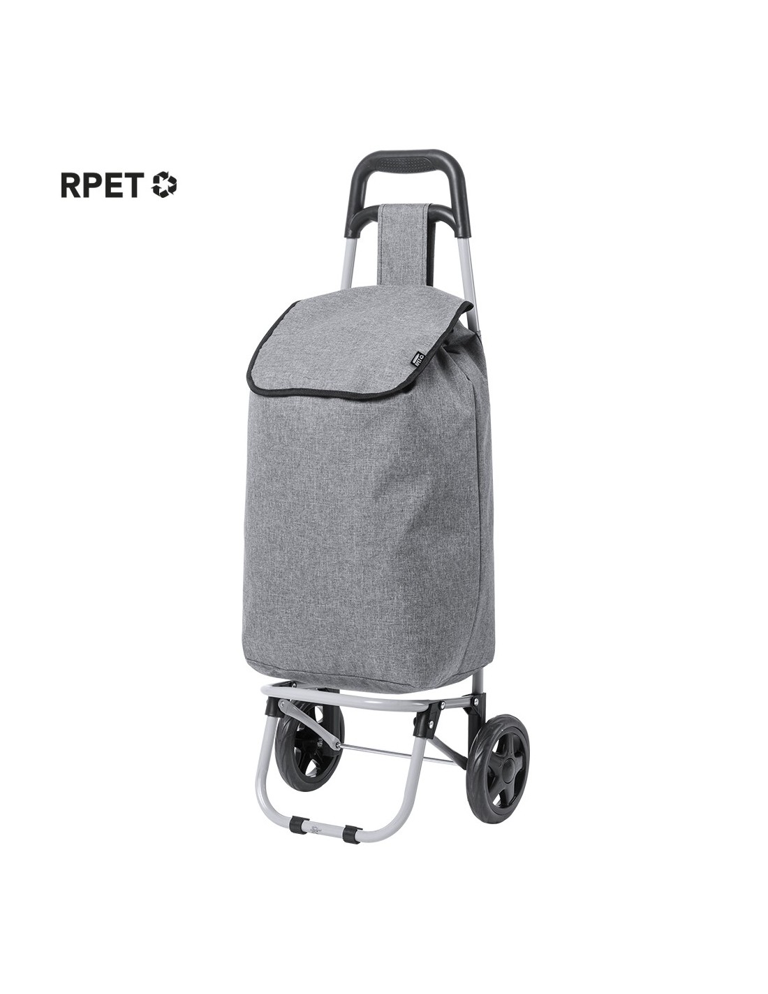 Carro de compra plegable y línea nature. Fabricado en resistente poliéster 600D RPET, elaborado a partir de plástico reciclado, para así fomentar la reutilización de residuos plásticos y ayudar a la sostenibilidad del planeta. Con asa reforzada, cuerpo metálico tubular, bolsillo de cremallera posterior y soportes con gomas de protección. Ruedas reforzadas de alta calidad. Etiqueta distintiva RPET en la solapa.