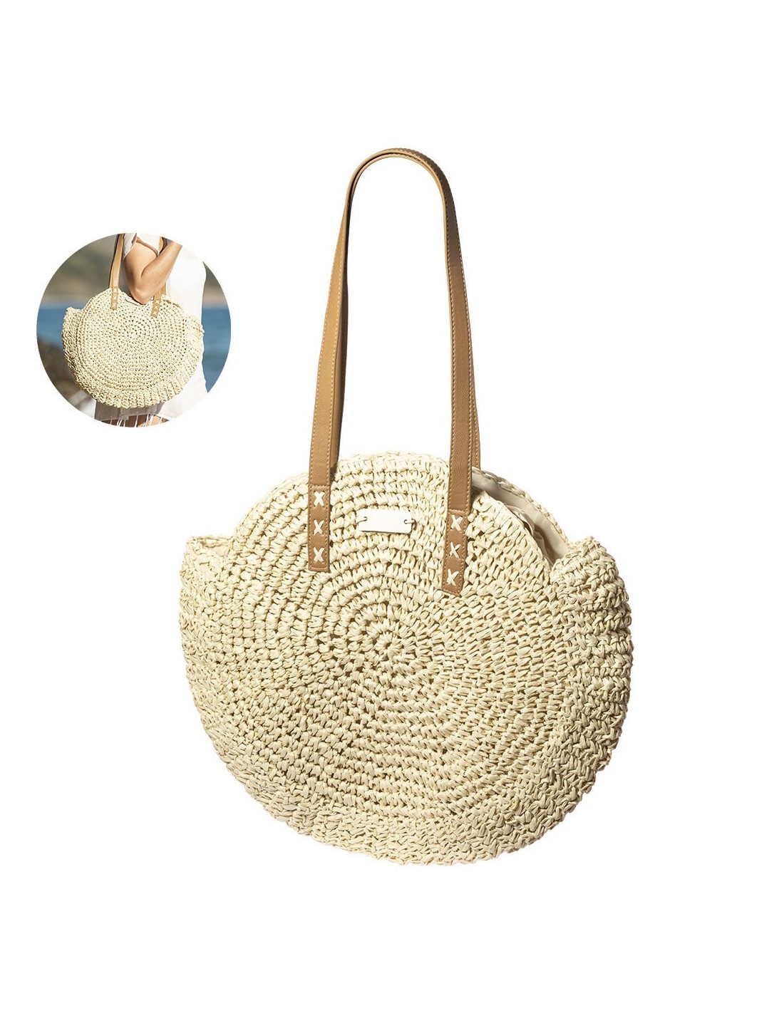 Bolso de desenfadado diseño en rafia sintética y con forma circular, un must. Compartimento principal de cierre de cremallera y tirador metálico, con bolsillo en el interior. Forro interior y asas largas en PU, con triple refuerzo en X y superficie para personalización en madera, especialmente diseñada para marcaje en láser.