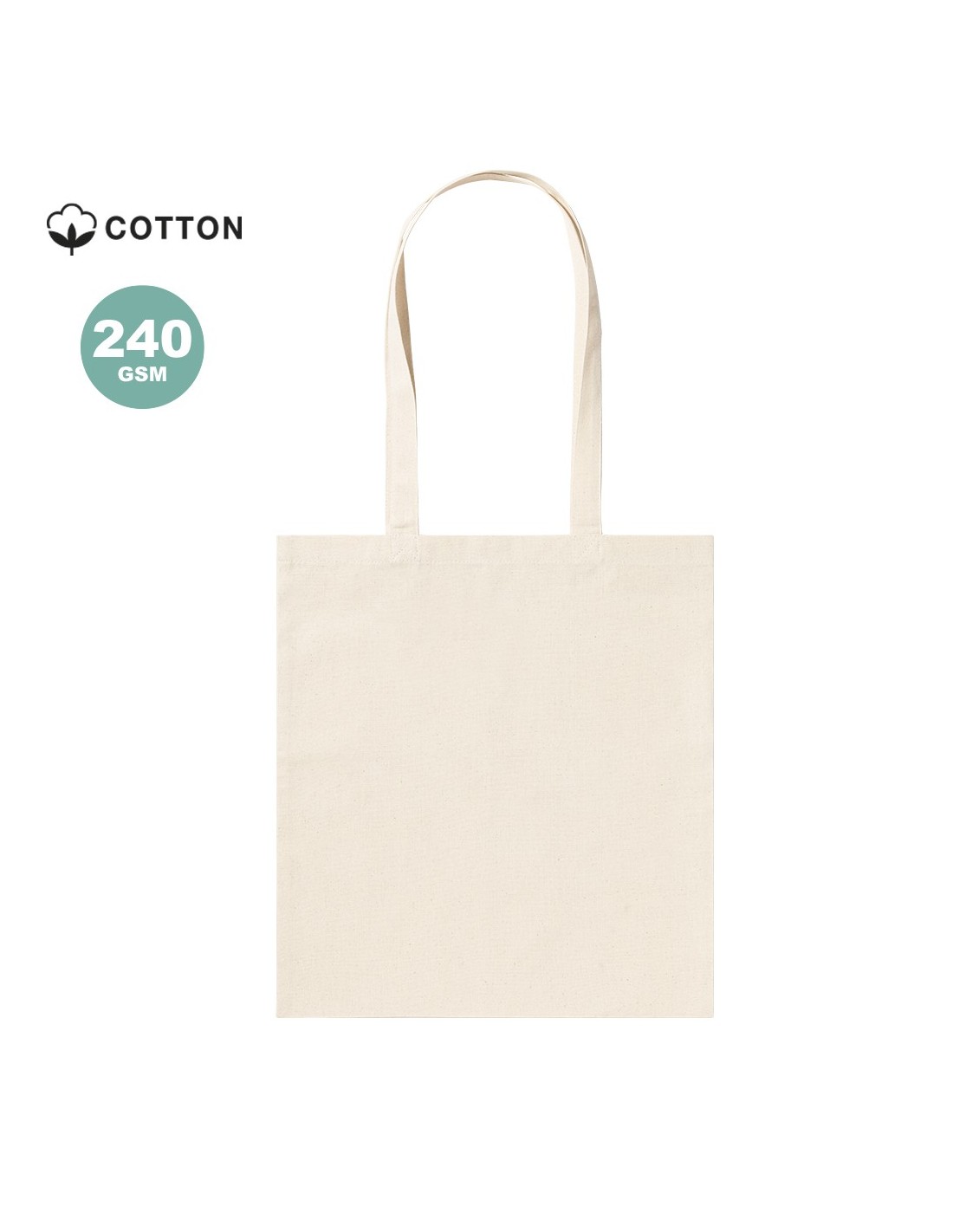 Bolsa en resistente material 100% algodón de 240g/m2 con acabado en color natural. Con asas largas reforzadas de 70cm y acabado cosido. Resistencia hasta 9kg de peso.