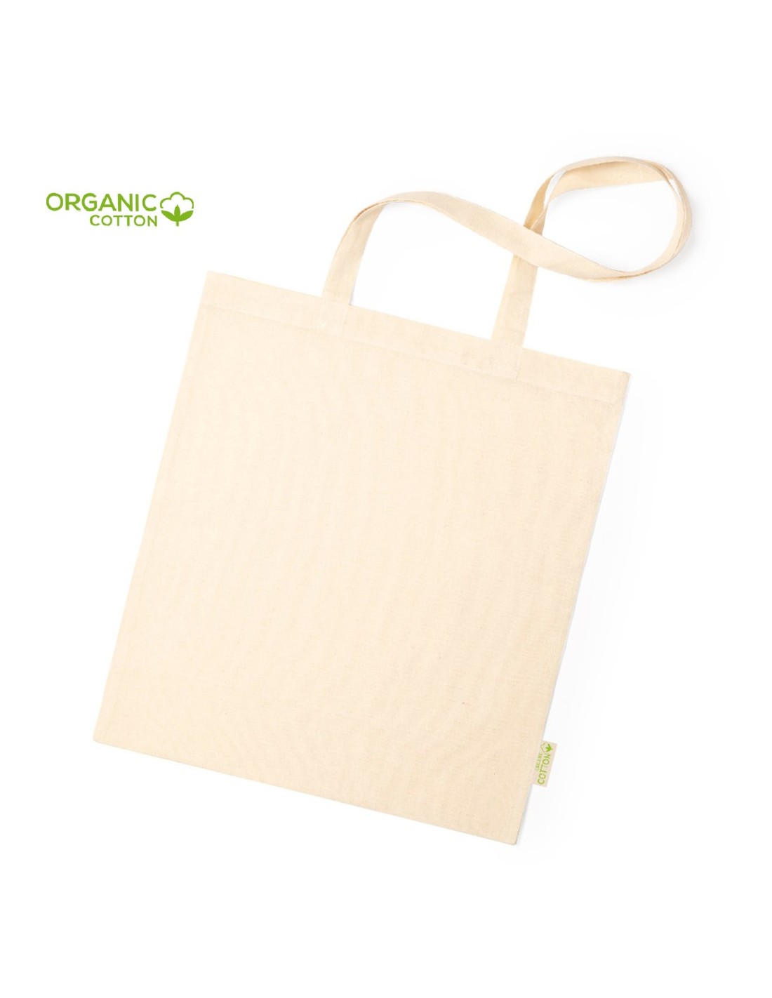 Bolsa de línea nature en material 100% algodón orgánico natural de 120 g/m2. Asas largas de 70cm con refuerzo y de acabado cosido. Distintivo organic en etiqueta lateral y resistencia hasta 8 kg de peso.