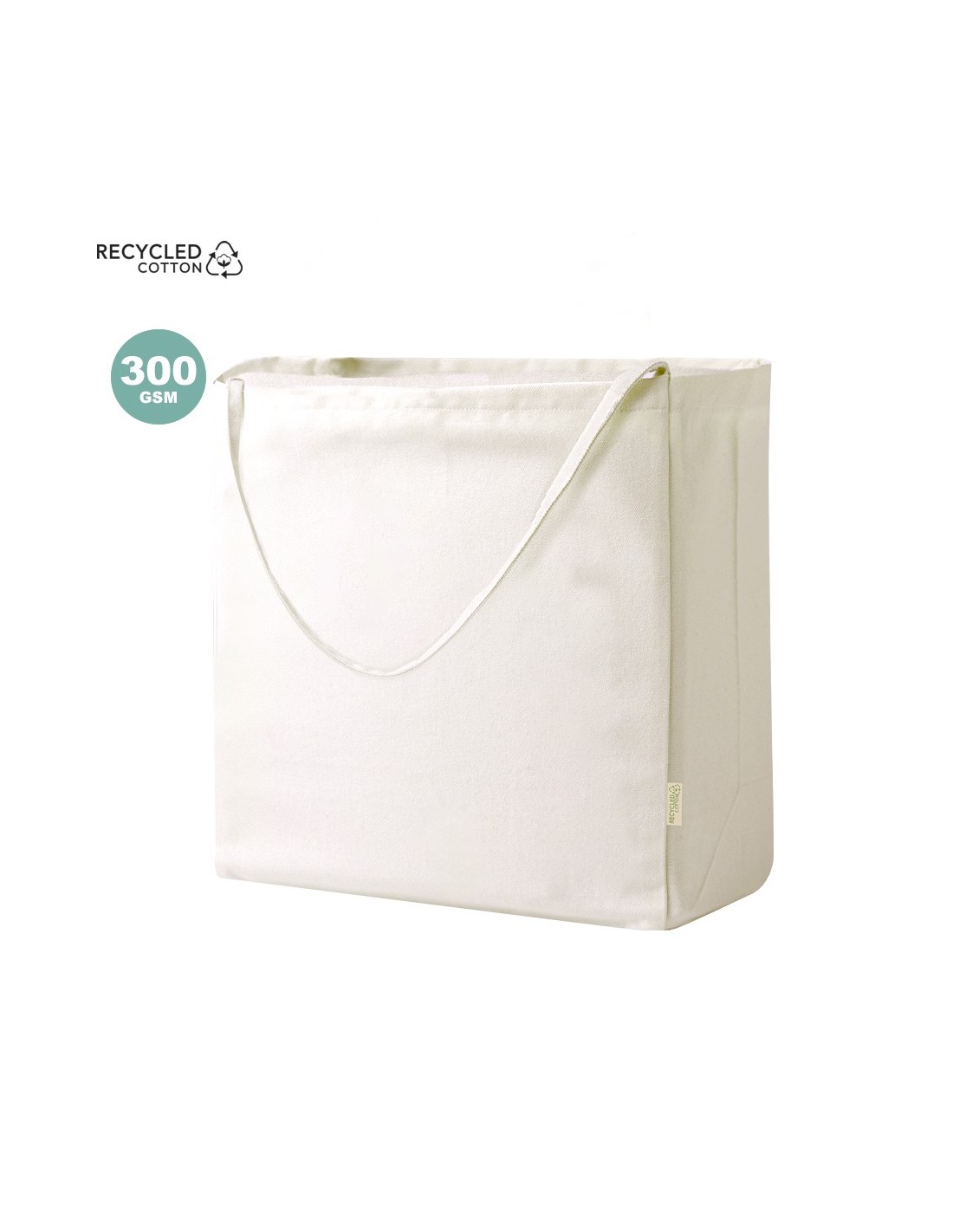 Bolsa en material 100% algodón reciclado de 300 g/m2. Asas largas de 60cm con refuerzo, de acabado cosido y fuelle. Logotipo en etiqueta lateral y resistencia hasta 12 kg de peso. Disponible en color natural.