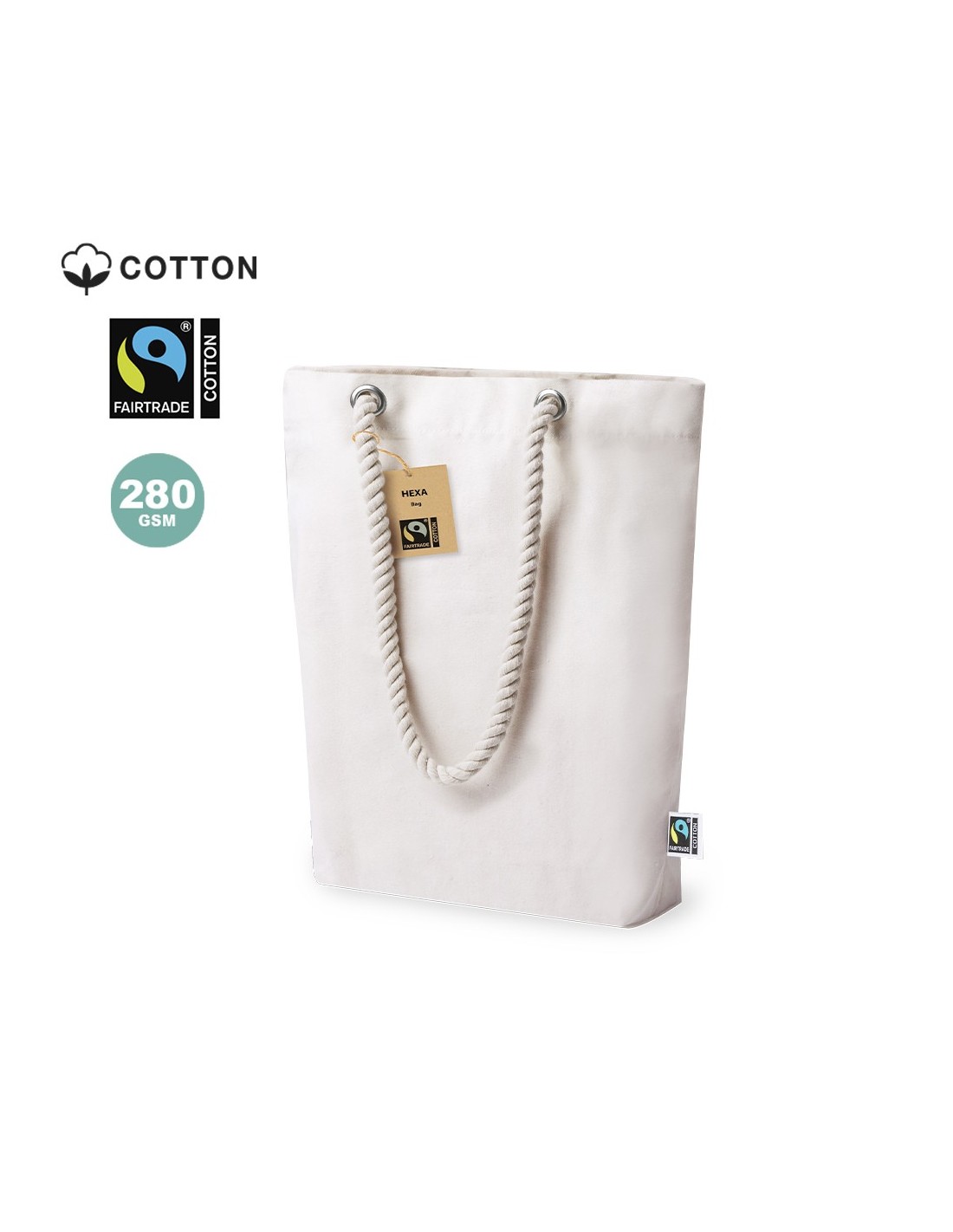 Bolsa de línea nature, fabricada en 100% algodón de 280g/m2 de color natural. Con certificación Fairtrade (Comercio Justo) un sistema comercial solidario y alternativo al convencional que persigue el desarrollo de los pueblos y la lucha contra la pobreza. De acabado cosido, asas en forma de cuerda y argollas para mayor firmeza. Resistencia hasta 10kg de peso. Incluida etiqueta Fairtrade y etiqueta con logotipo en cartón reciclado.