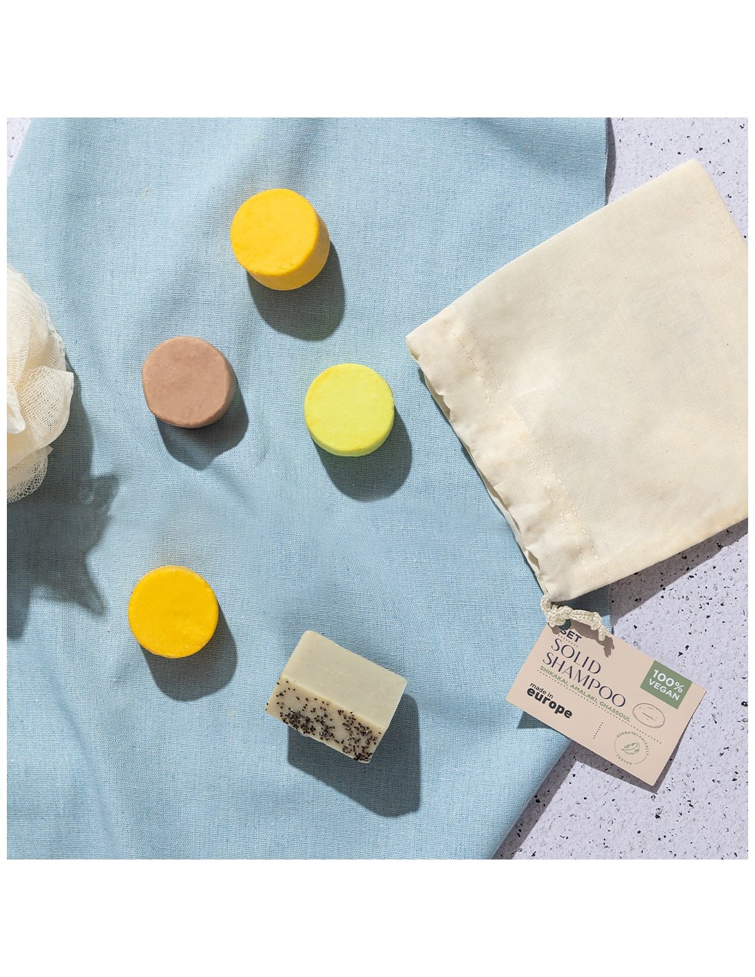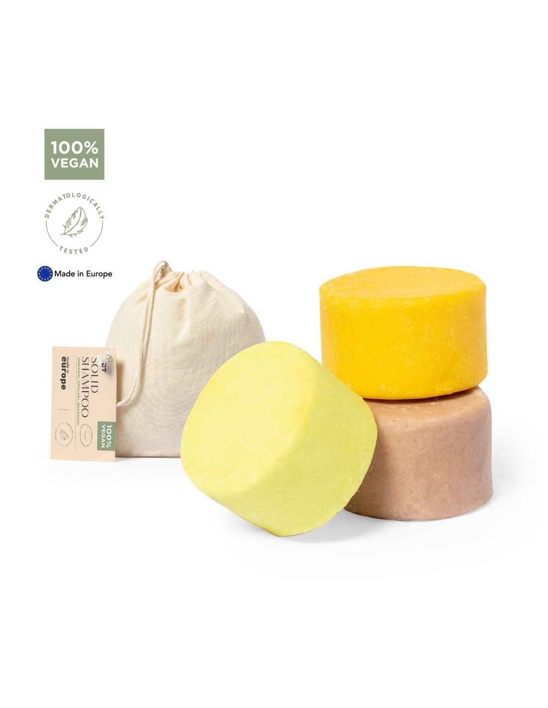 Set vegano de champús. Contenido: 1 x champú sólido Shikakai de 30 gr, elaborado con una selección de ingredientes activos como la oliva virgen, manteca de karité bio, zanahoria y extractos botánicos de shikakai. Rico en vitamina E, aportando al cabello limpieza, sedosidad y vigor. De agradable fragancia que aporta un estado de placer y bienestar interior. 1 x champú sólido Amalaki de 30 gr, con extractos de plantas y especias. Enriquecido con cúrcuma, amalaki, aguacate, oliva, jojoba, rosa damascena, pomelo blanco y naranja, que aportan una hidratación profunda y un brillo impresionante. 1 x champú sólido Ghassoul de 30 gr. Con ghassoul procedente de Marruecos, aportando flexibilidad, volumen y brillo; sin alterar la queritina natural. Rico en manteca de karité, aportando hidratación y suavidad. La mandarina aporta brillo; y los aceites esenciales de incienso, geranio, lavanda y rosa le dan un aroma cautivador que te llevará a un estado de equilibrio y paz. Presentación en bolsa individual de algodón, con cierre de cordón y etiqueta distintiva. Dermatológicamente testado y de fabricación europea. Producto sostenible y 100% vegano, sin ingredientes de procedencia animal. Además, no se han realizado pruebas de estos productos en animales, promoviendo el cuidado y respeto de todos ellos.