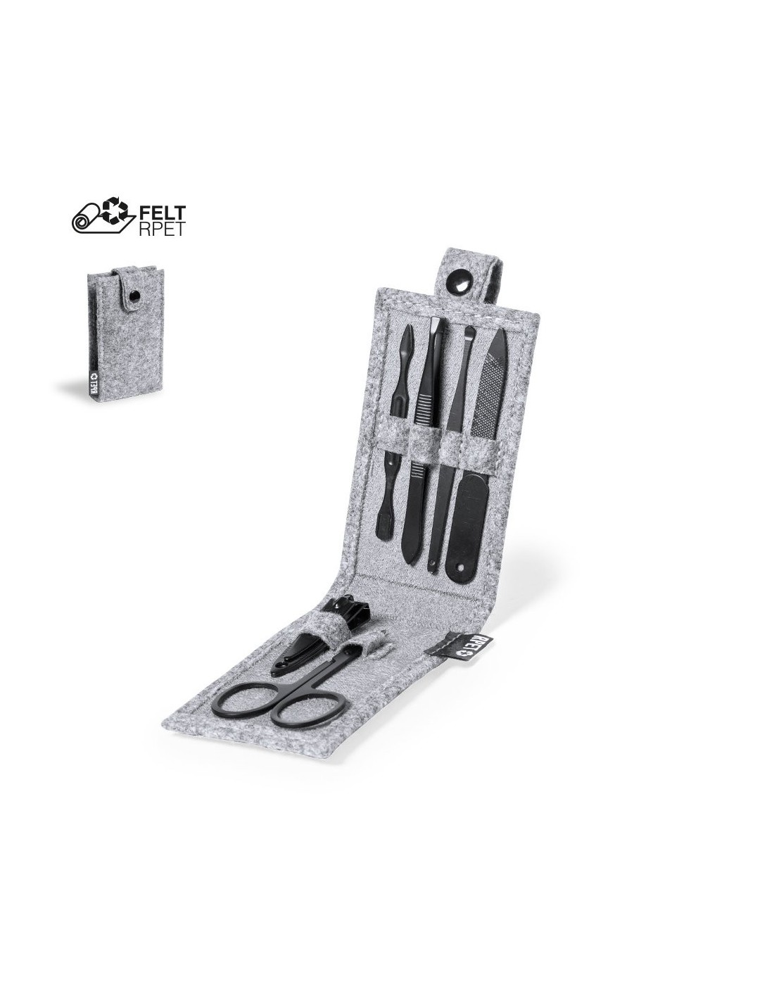 Set de manicura de 6 accesorios, con funda fabricada en resistente fieltro RPET, fruto de la combinación del proceso de reciclaje de materiales plásticos junto con la técnica milenaria de fabricación del fieltro, dando como resultado un material de eco-tendencia que, además de ser de origen reciclado, también se convierte en reciclable. Accesorios metálicos en acero inox de acabado negro: tijeras, pinzas, cortaúñas, lima y 2 quitacutículas. Con cierre de botón y etiqueta distintiva RPET en exterior.