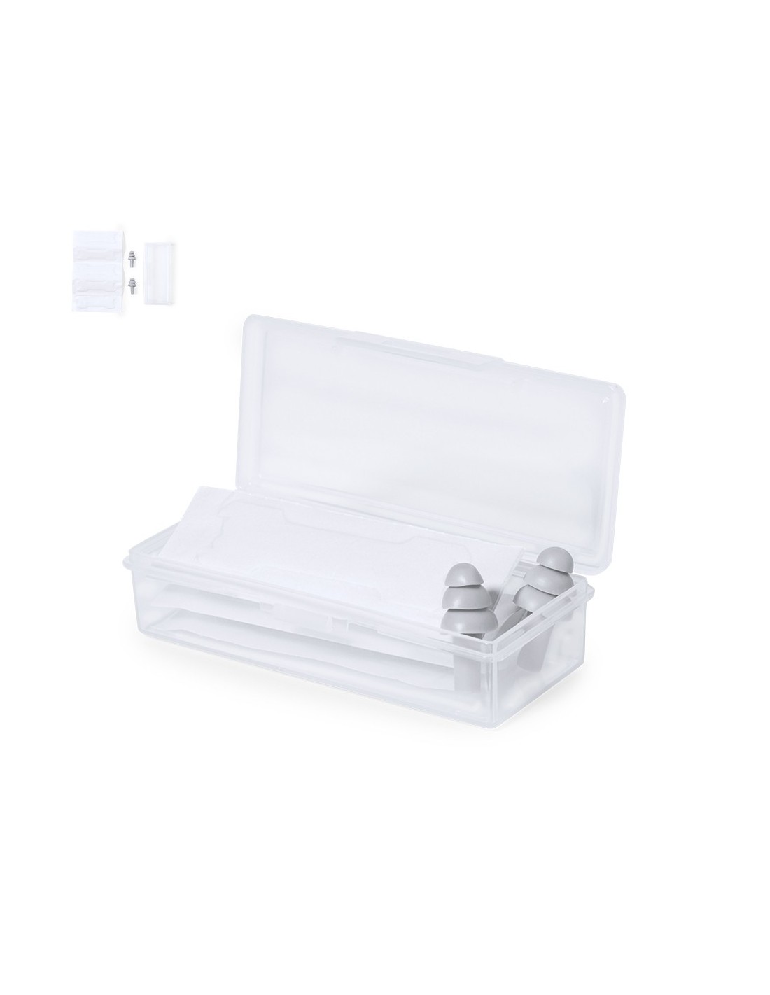 Set de tapones para oído y tiras nasales adhesivas. Práctico kit de descanso provisto de un par de tapones para oídos reutilizables hechos en suave silicona y 5 tiras nasales autoadhesivas, para un alivio inmediato. Presentado en una caja de plástico transparente.