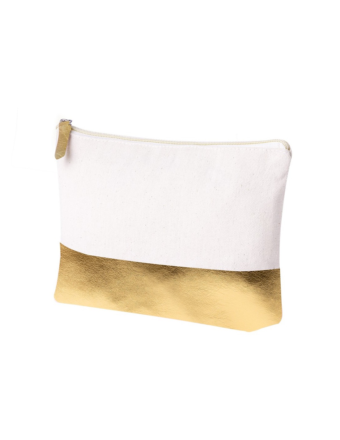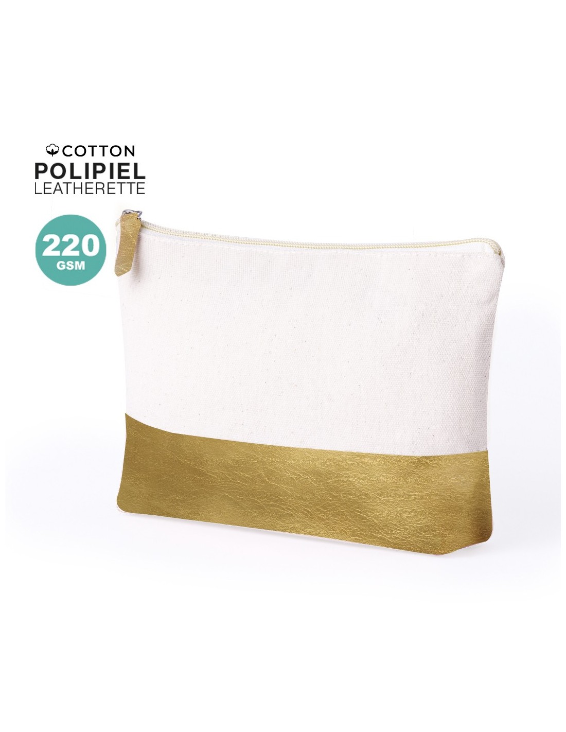 Neceser en material 100% algodón reciclado de 220 g/m2. Con cierre de cremallera a juego con la base. Disponible en color natural con base de color metalizado en polipiel.