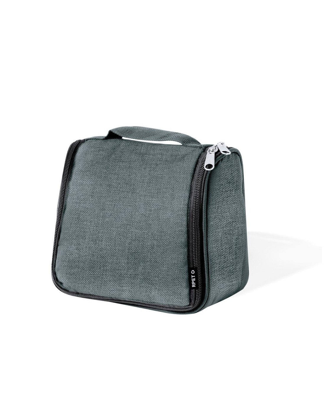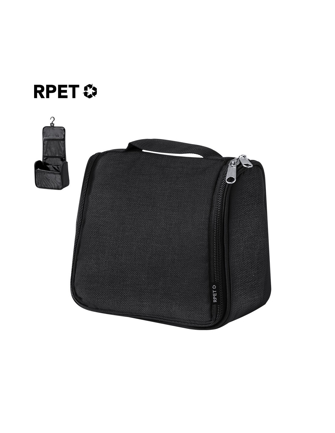 Neceser fabricado en RPET para guardar los objetos de higiene personal, con práctico gancho para poder sujetarlo en cualquier sitio. Práctico Interior con bolsillos de redecilla transpirables, que permiten ver los objetos que hay dentro. Con logotipo RPET en etiqueta. Disponible en varios colores y presentado en una bolsa individual reciclada. .El material RPET se elabora a partir de plástico reciclado, para así fomentar la reutilización de residuos plásticos y ayudar a la sostenibilidad del planeta.