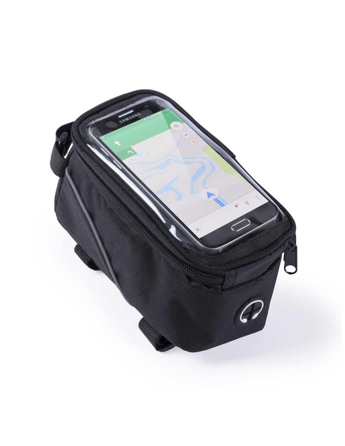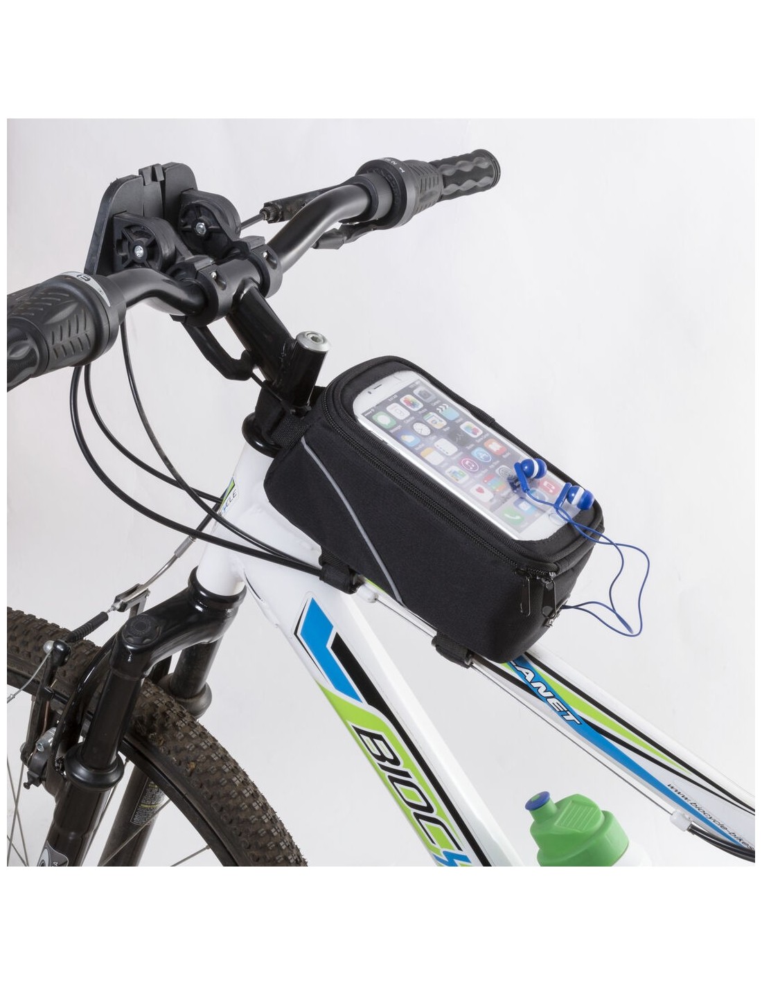 Bolsa multiusos para bicicleta en resistente poliéster 600D con acolchado y frontal de PVC con función táctil. Con salida de auriculares, cierre de cremallera e interior forrado con compartimento para smartphone. Cierre triple de velcro para acople en bar