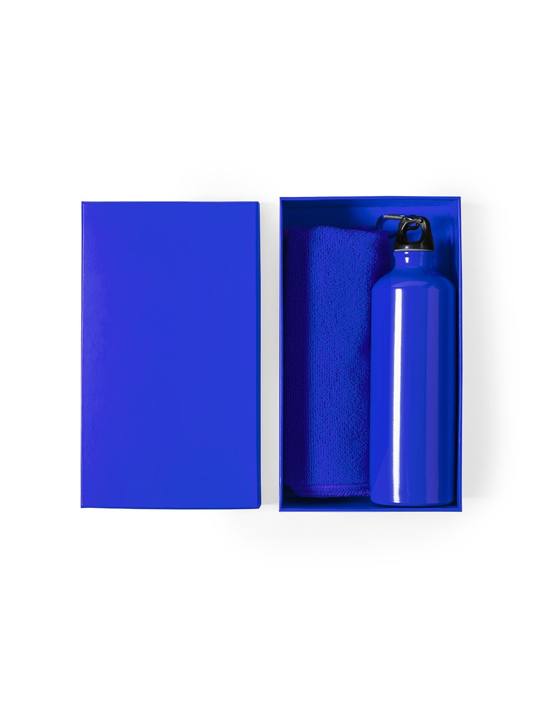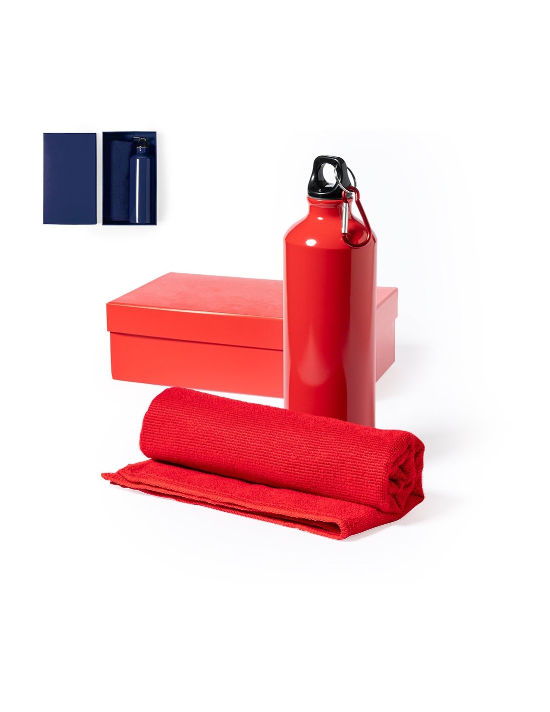 Set de bidón y toalla a juego. Incluye:Bidón de 800 ml de capacidad con cuerpo en aluminio de acabado brillo. Con tapón de seguridad a rosca y mosquetón metálico de transporte.Toalla absorbente fabricada en microfibra de 160g/m2 y tamaño 40x90 cm.Set disponible en variada gama de colores y presentado en caja de cartón con colores a juego.
