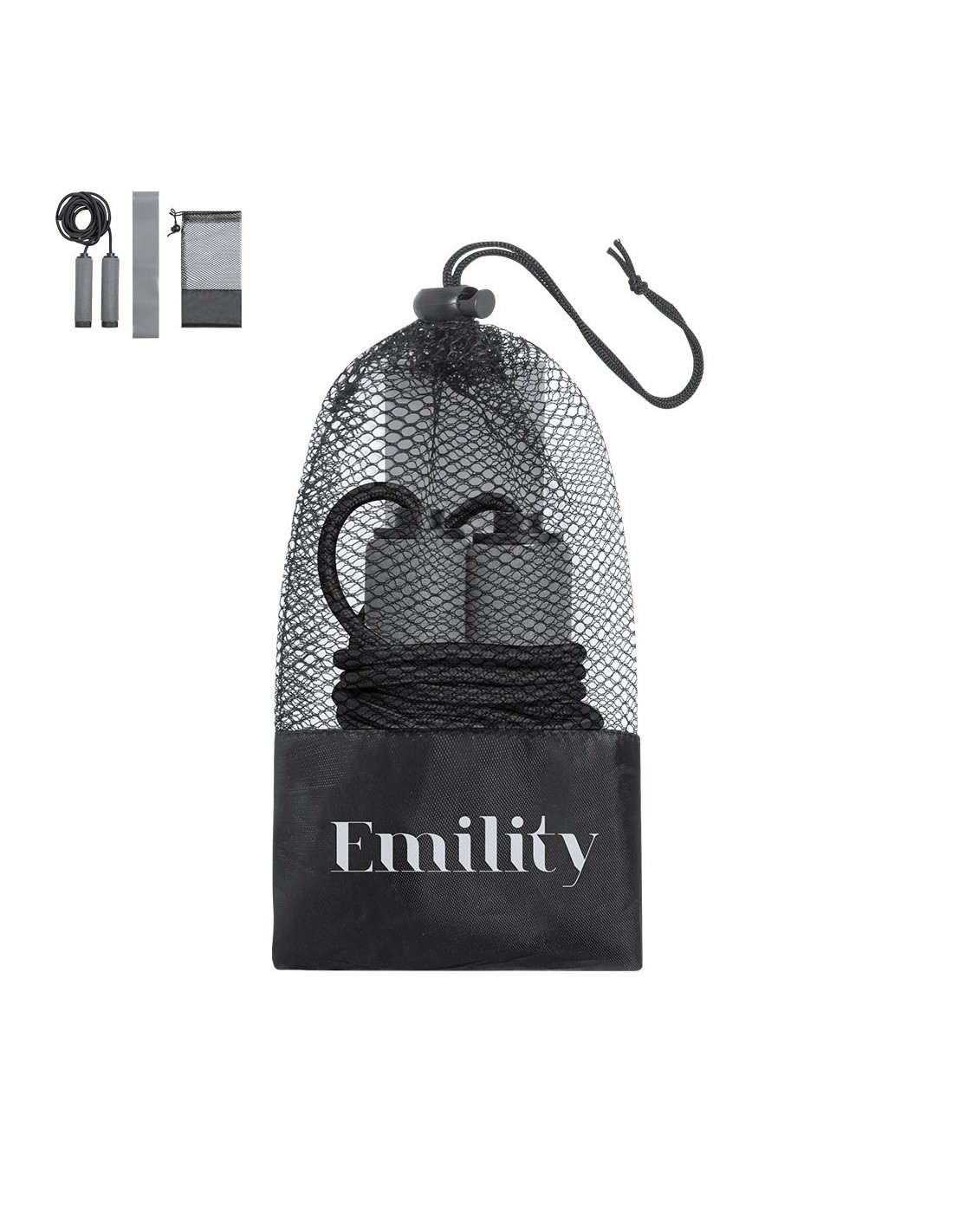 Set de goma elástica y comba para los más deportistas. Incluye: 1 cinta de 25x5 cm fabricada en resistente material TPE y resistencia media 1 comba de 260 cm, con mangos en resistente material HIPS forrados en EVA. Presentado en funda de poliéster con cierre de cordón y accesorio de ajuste.