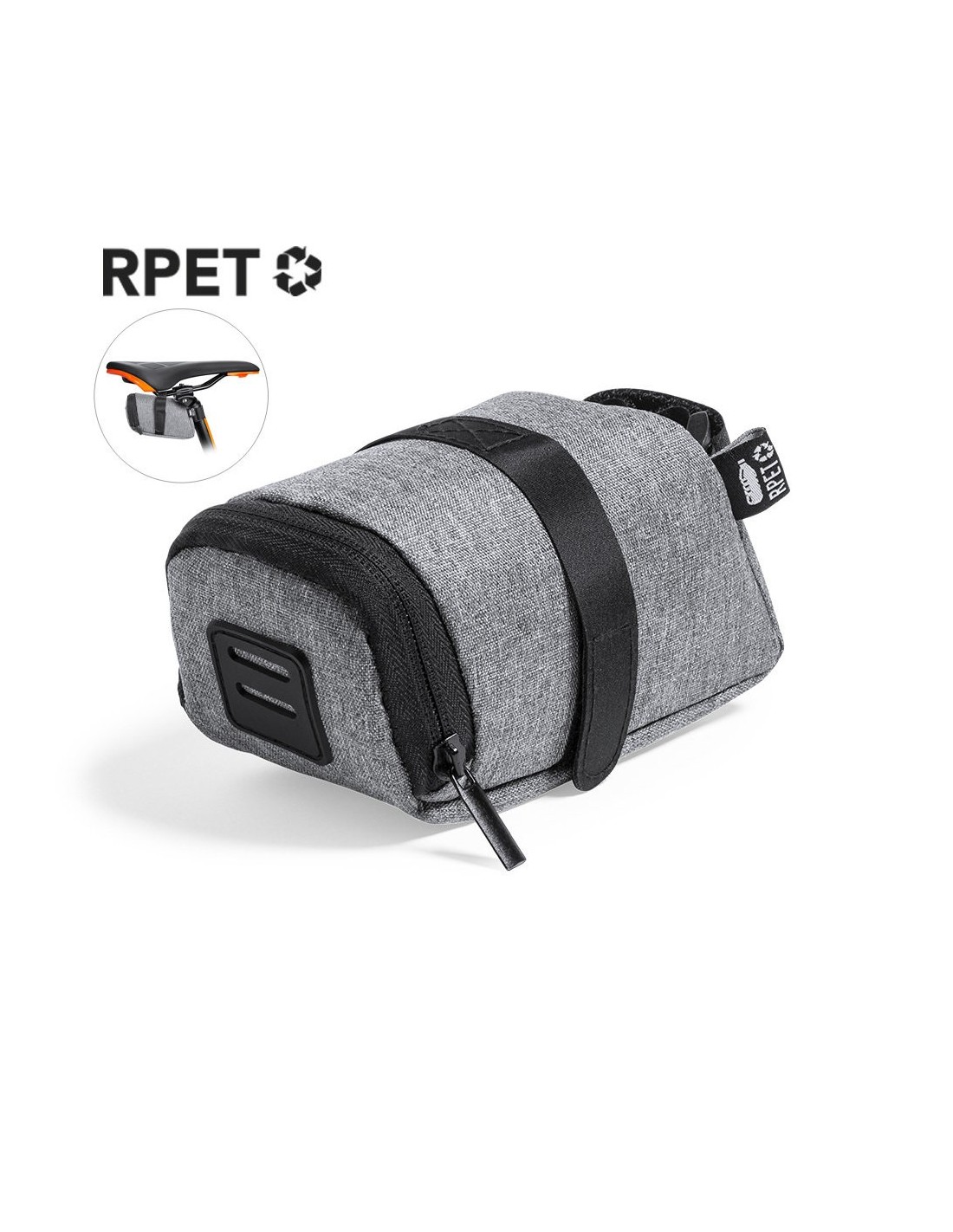 Bolsa para sillín fabricada en resistente 600D RPET. De acabado gris jaspeado.con ribetes de refuerzo y compartimento principal con cierre de cremallera. Incluye doble cinta de ajuste en barra y sillín con cierre de velcro. Con distintivo RPET en etiqueta exterior. El material RPET se elabora a partir de plástico reciclado, para así fomentar la reutilización de residuos plásticos y ayudar a la sostenibilidad del planeta.