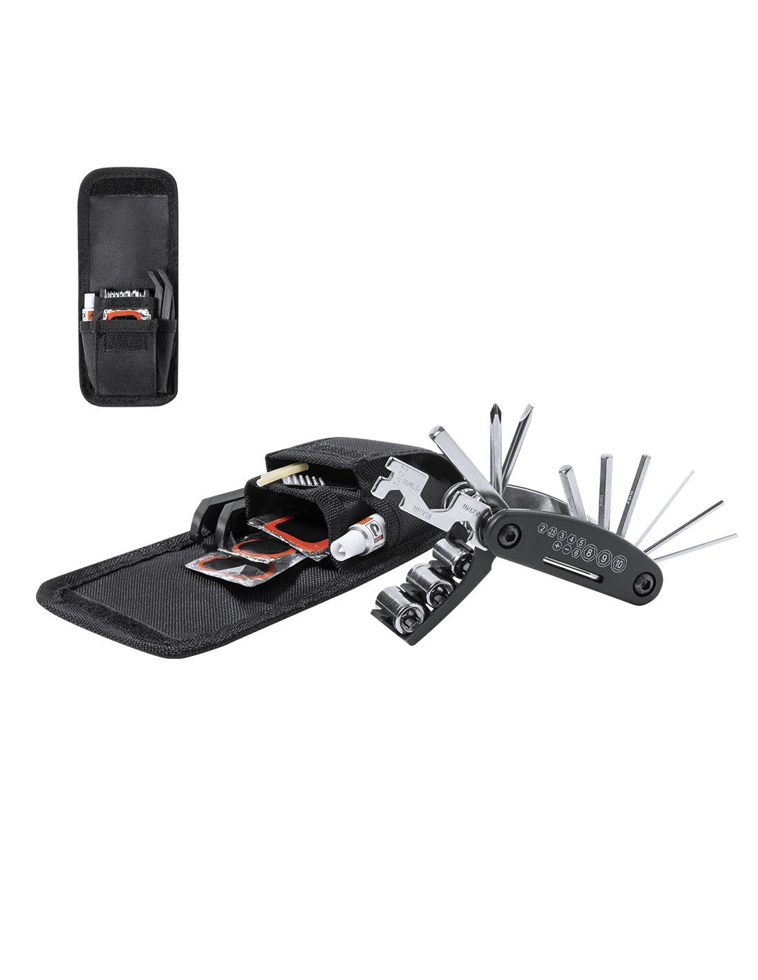Completo kit de reparación para bici de 14 accesorios. Presentado en resistente estuche de poliéster 600D, con cierre de velcro. Incluye desmontadores de cubierta, multiherramienta y kit de reparación de pinchazos.