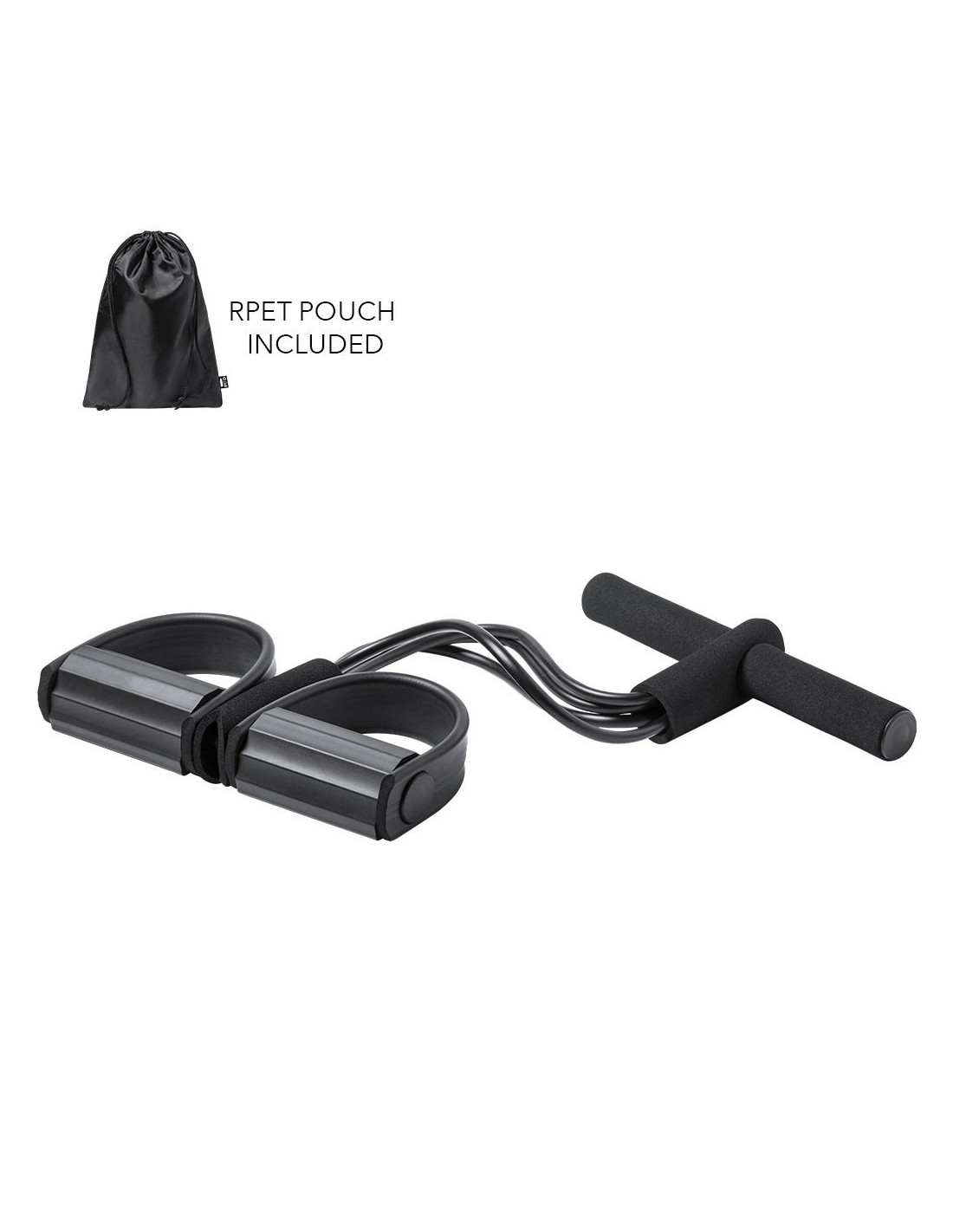 Cuerda de tensión para mantenerse en forma al aire libre o desde casa, diseñada para realizar una gran variedad de ejercicios. Fabricada en resistente combinación de ABS y EVA. con asas ergonómicas acolchadas en espuma y soportes para pies recubiertos en EVA, con calapiés de seguridad. De resistencia media y con folleto de ejercicios. Presentada en funda a juego de poliéster RPET, elaborada a partir de plástico reciclado para así fomentar la reutilización de residuos plásticos y contribuir a la sostenibilidad del planeta. Etiqueta RPET distintiva en funda.