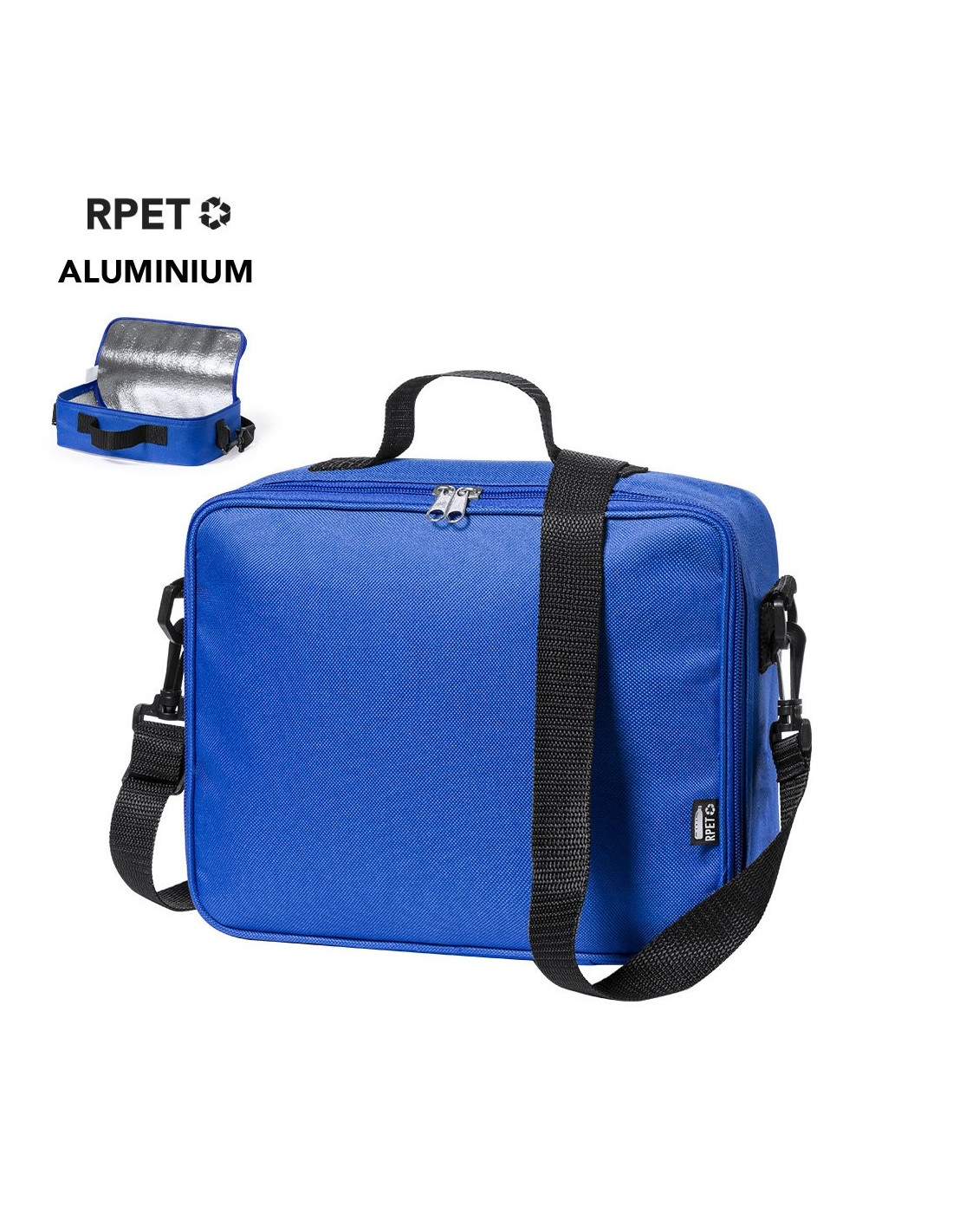 Nevera para niño de línea nature y en resistente 600D RPET, elaborado a partir de plástico reciclado para así fomentar la reutilización de residuos plásticos y contribuir a la sostenibilidad del planeta. Detalles en negro y base reforzada. Compartimento principal con cierre de cremallera e interior isotermo en aluminio. Incluye cinta bandolera ajustable y asa de transporte reforzada. Con distintivo RPET en etiqueta exterior y disponible en variada gama de colores.