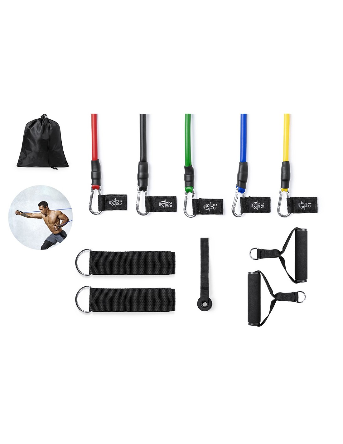 Completo set de gomas elásticas para mantenerse en forma al aire libre o desde casa. Incluye 5 cintas de goma elásticas de diferente color y niveles de resistencia: Amarillo hasta 4,5 kg Azul hasta 6,8 kg Verde hasta 9,1 kg Negro hasta 11,4 kg Rojo hasta 13,6 kg Incluye mosquetones metálicos para un ajuste seguro, 2 asas antideslizantes para las manos, accesorio de anclaje para la puerta y 2 cintas para los tobillos. Presentado en bolsa individual con cierre de cordón y accesorio de ajuste + caja diseño. Con manual de instrucciones en español e inglés.