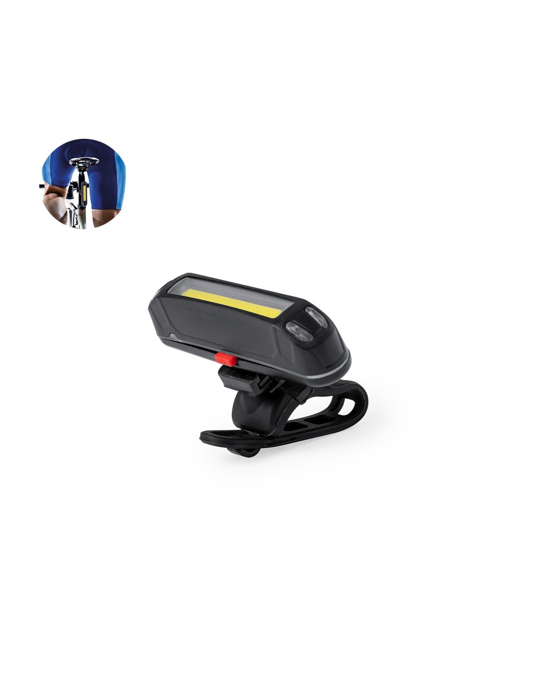 Luz de seguridad para bicicletas con cinco posiciones de luz (fija blanca o roja, intermitente rojo rápido o lento, mixto con luz blanca y roja). Recargable gracias a su batería de 350 mAh de capacidad, con cable de carga incluido. Con accesorio de acople válido para cualquier bicicleta y presentada en caja de diseño kraft.