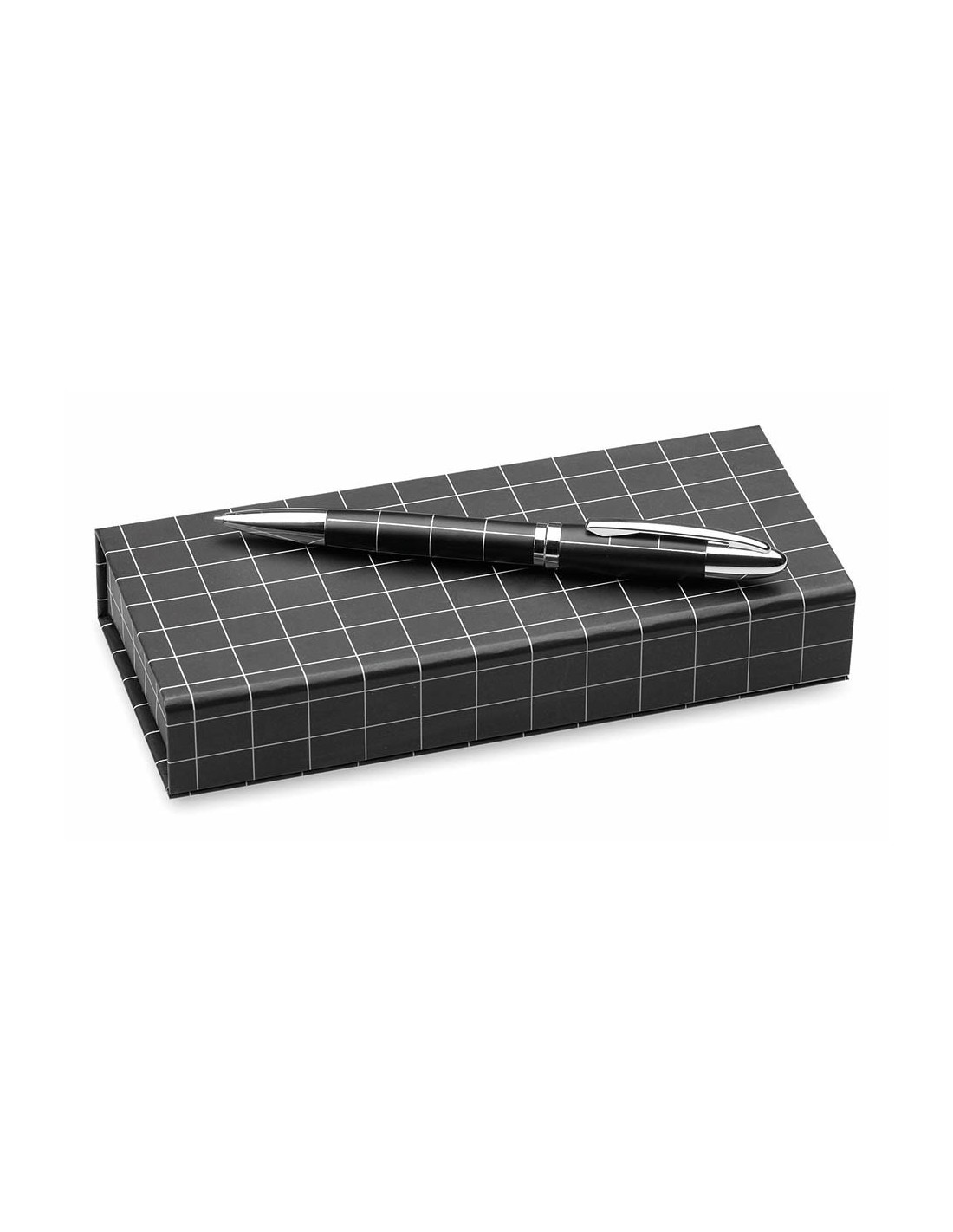 Elegante bolígrafo de mecanismo giratorio en sobrio diseño bicolor. De cuerpo metálico en suave acabado con accesorios en colores plateados. Presentado en elegante estuche individual en color negro con cierre de imán. De cartucho jumbo, con recambio inclu