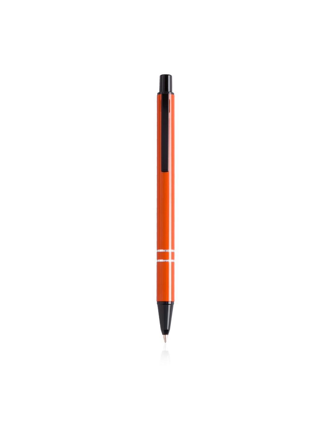 Bolígrafo de mecanismo pulsador en original diseño bicolor. Con cuerpo en aluminio de suave acabado en alegres colores. Accesorios en color negro y anillas en plateado. Tinta azul.