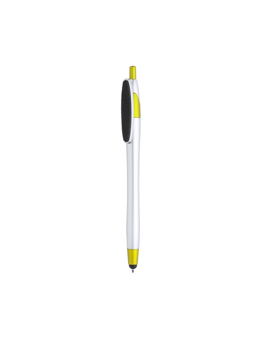 Bolígrafo puntero de mecanismo pulsador de atrevido diseño bicolor con accesorios en vivos colores y cuerpo curvado de suave acabado metalizado en color plateado. Original clip limpiador de pantalla integrado y tinta azul.