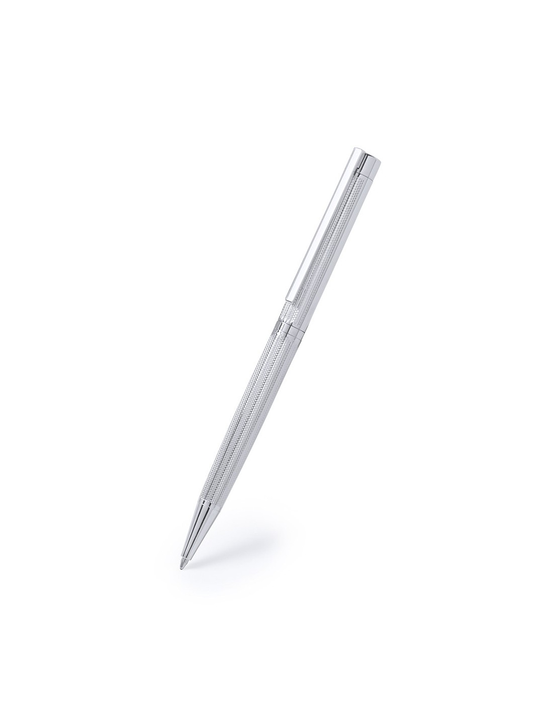 Elegante bolígrafo de mecanismo giratorio en sobrio diseño. De cuerpo metálico antideslizante en acabado plateado brillante con clip a juego. Presentado en elegante estuche individual de polipiel en color negro con interior en suave antelina blanca. En ti
