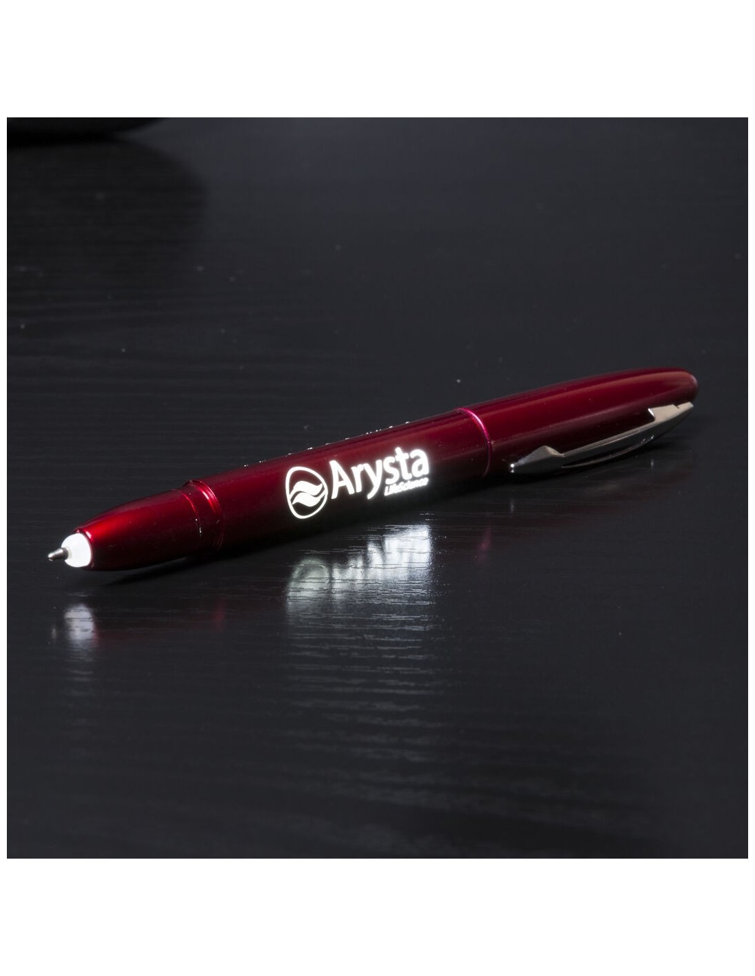 Bolígrafo puntero con capucha, luz led interior y cuerpo especialmente diseñado para marcaje en láser, iluminando así el logotipo. Con suave cuerpo en variada gama de colores metalizados y tinta azul. Pilas de botón incluidas.