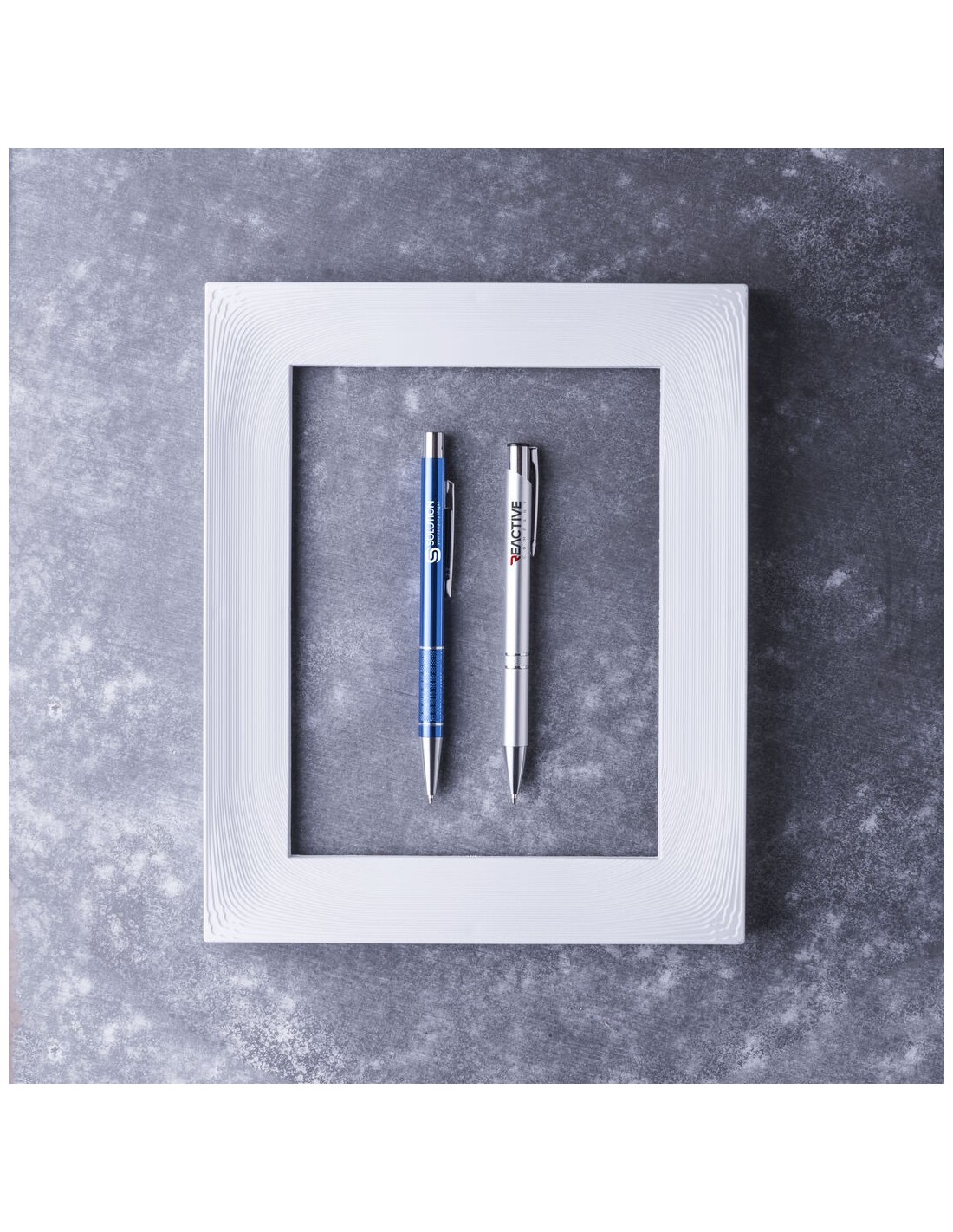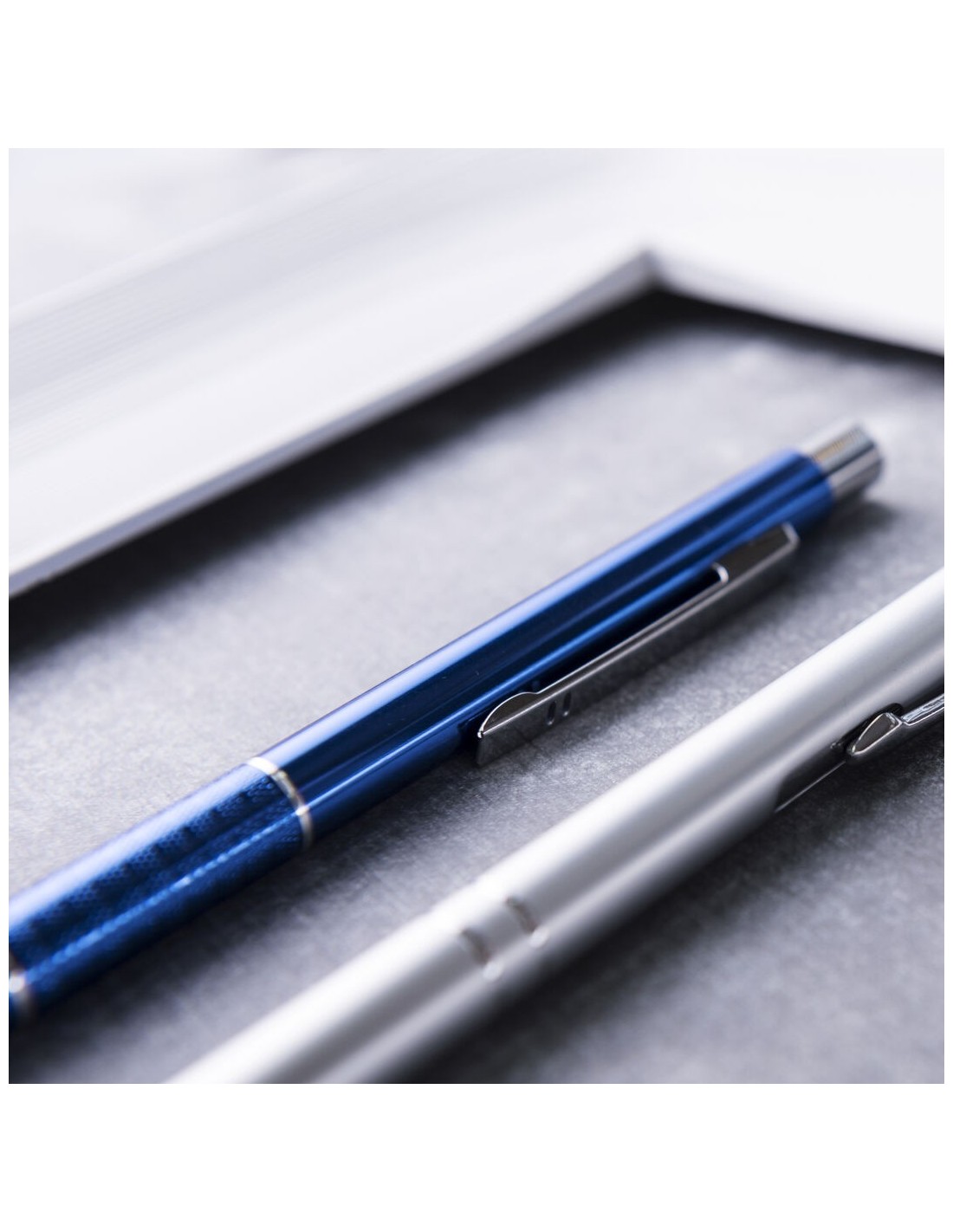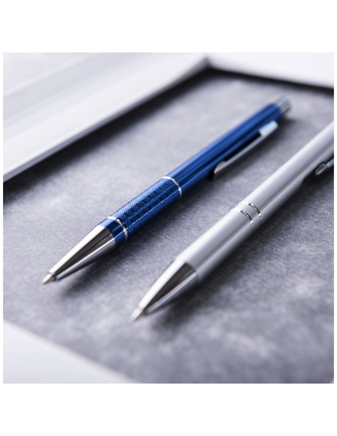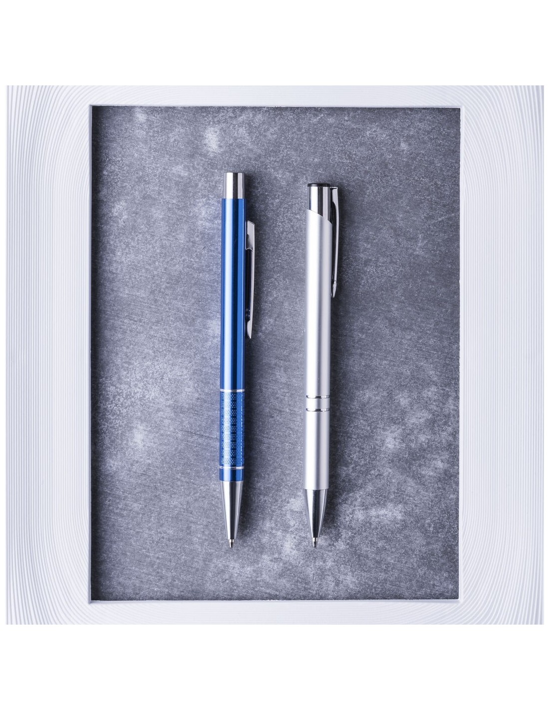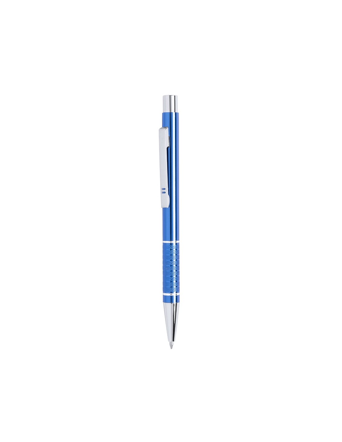 Elegante bolígrafo de aluminio con mecanismo pulsador en variada gama de vivos colores metalizados y accesorios en color plateado. Con original clip troquelado y empuñadura antideslizante. Tinta azul.