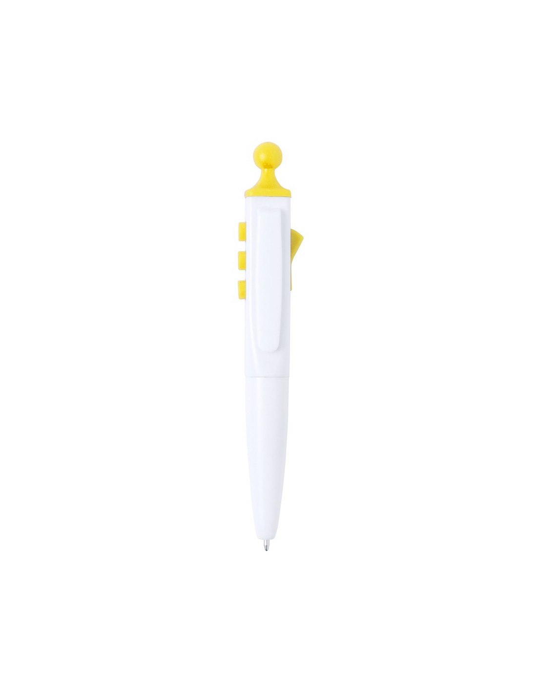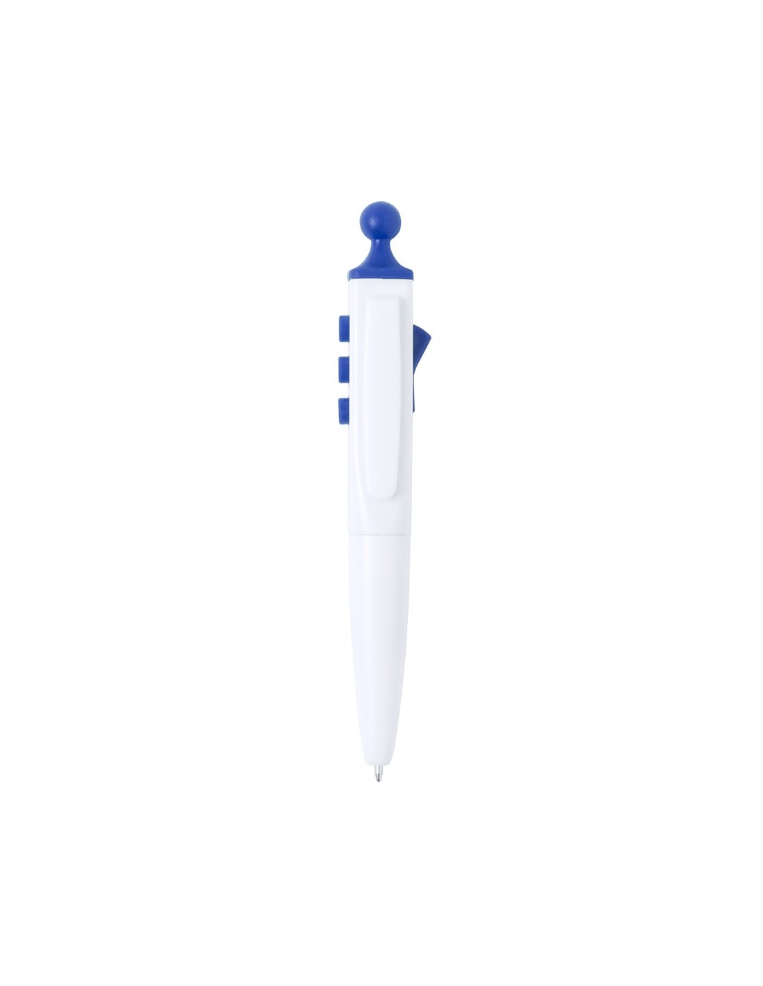 Relajante bolígrafo antiestrés con multitud de botones para pulsar y bolita flexible en parte superior. De mecanismo giratorio, con cuerpo en color blanco y accesorios en variada gama de vivos colores. Tinta azul.