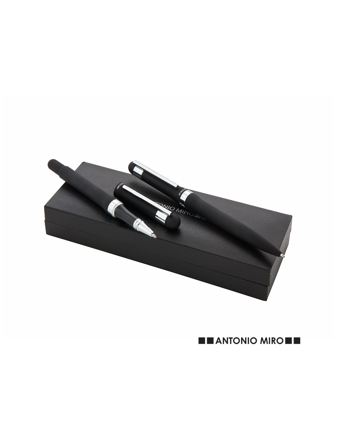 Elegante set de Antonio Miró con bolígrafo de mecanismo giratorio y roller de capucha y original anilla en sobrio diseño. De cuerpo metálico en acabado negro brillante con clip plateado. Presentado en elegante estuche individual en color negro con logotip