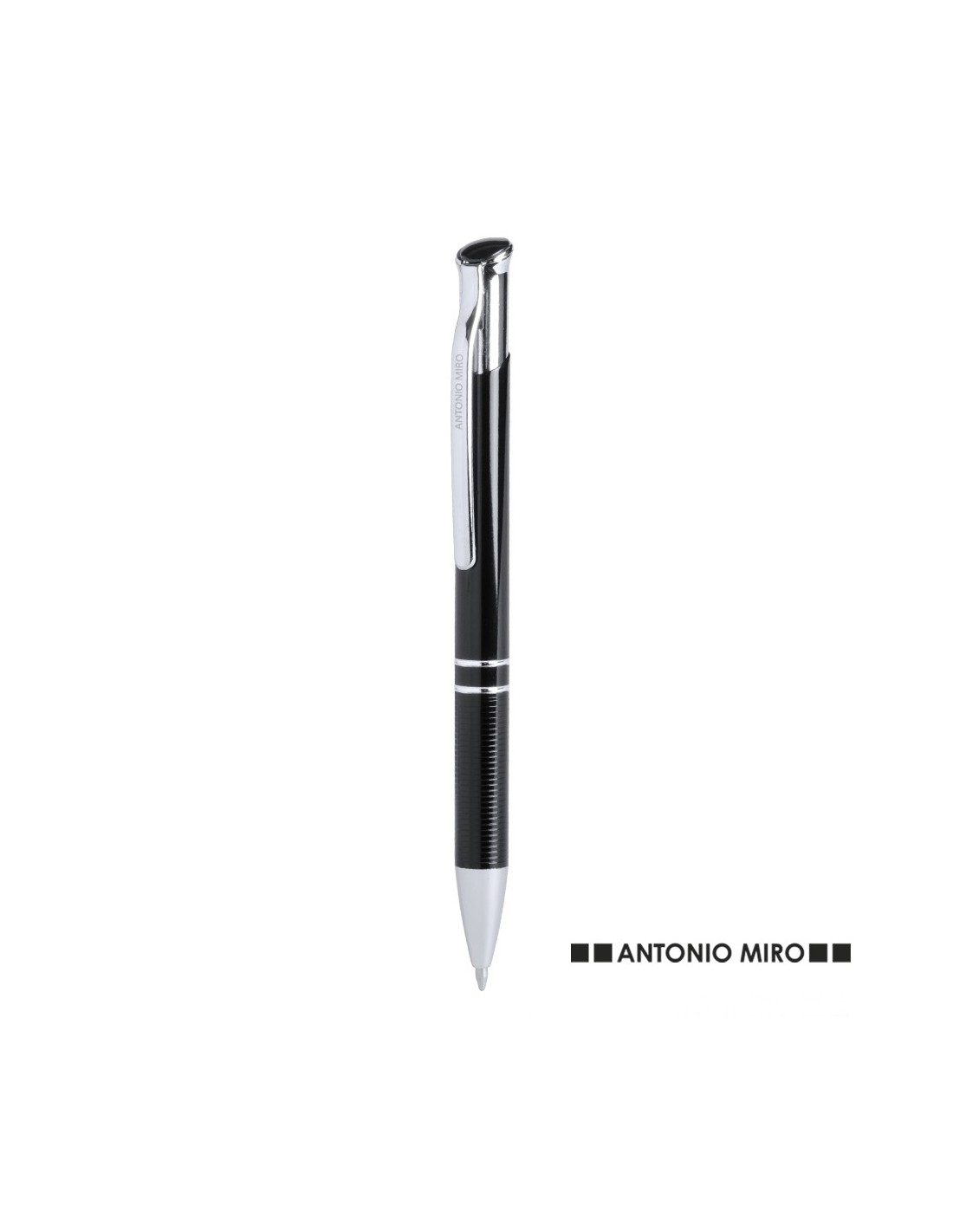 Bolígrafo de Antonio Miró de elegante diseño en color negro y suave cuerpo de aluminio con accesorios en color plateado. De mecanismo pulsador, con original clip metálico y presentado en estuche individual de aluminio negro con logotipo de la marca. Tinta