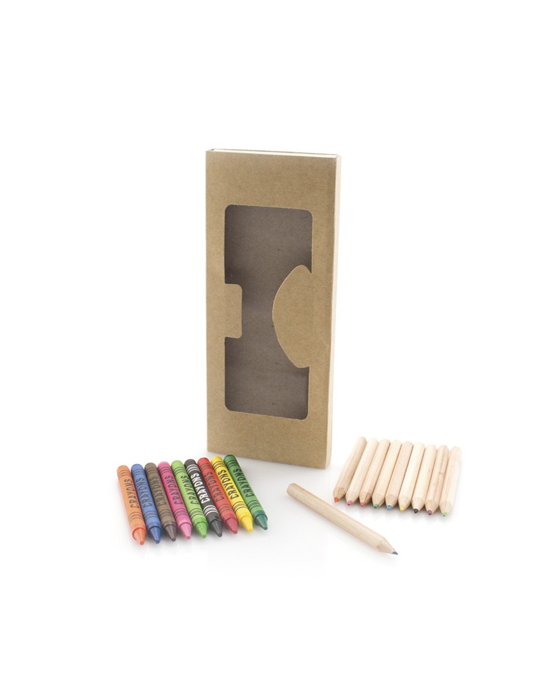 Set de 19 piezas en estuche con cuerpo en cartón natural con ventana y bandeja interior. Contiene ceras de cuerpo cilíndrico y lápices de madera natural de cuerpo hexagonal en variados colores.