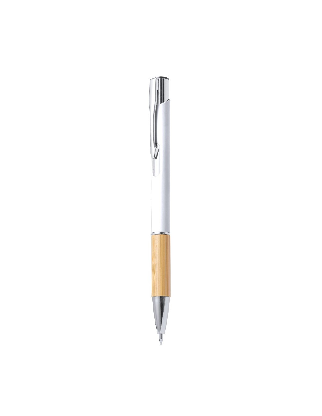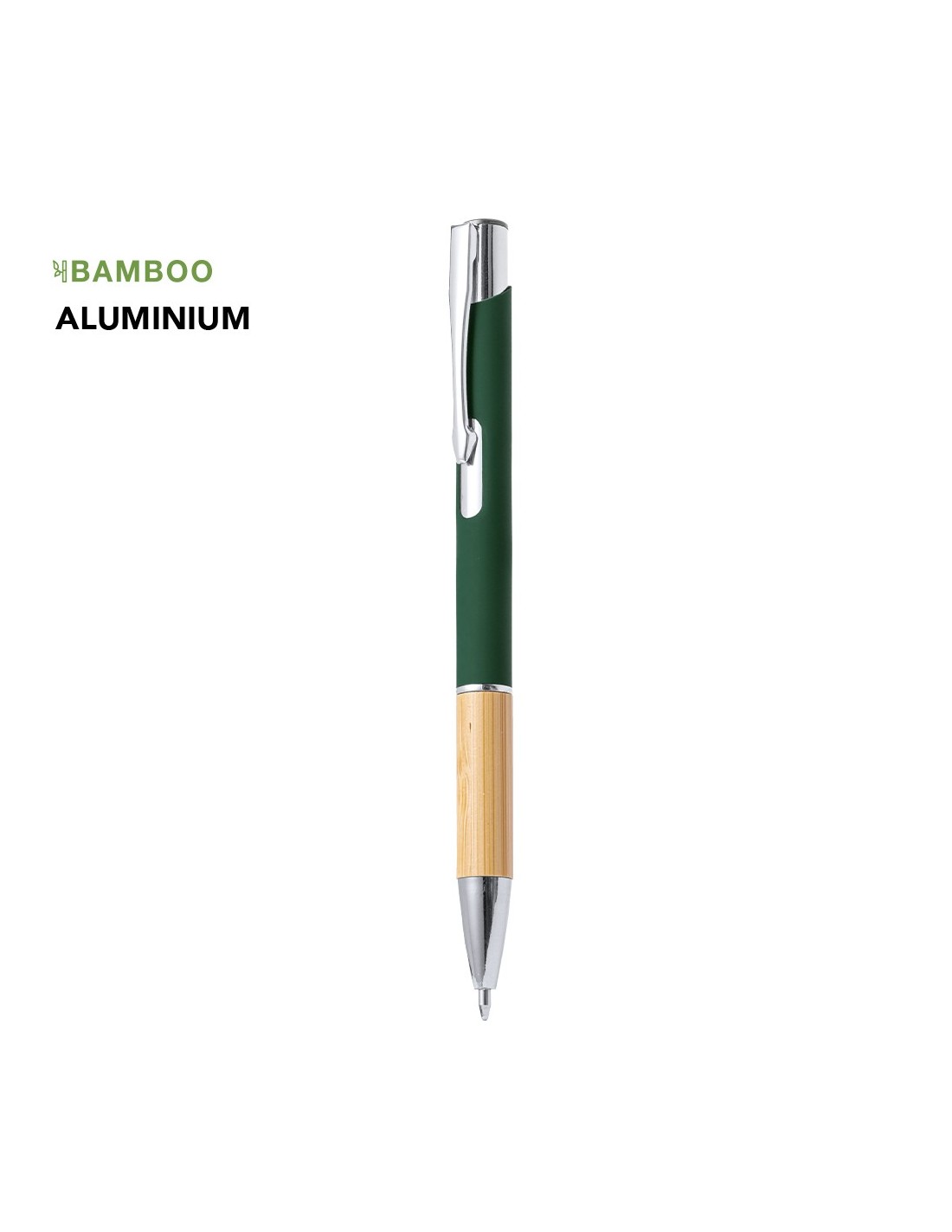 Elegante bolígrafo de línea nature y mecanismo pulsador. Cuerpo en resistente aluminio de acabado goma y empuñadura en bambú, con la caña en una amplia gama de distintivos colores. Clip metálico, con mecanismo pulsador y en tinta azul. Presentado en bolsa individual reciclada.
