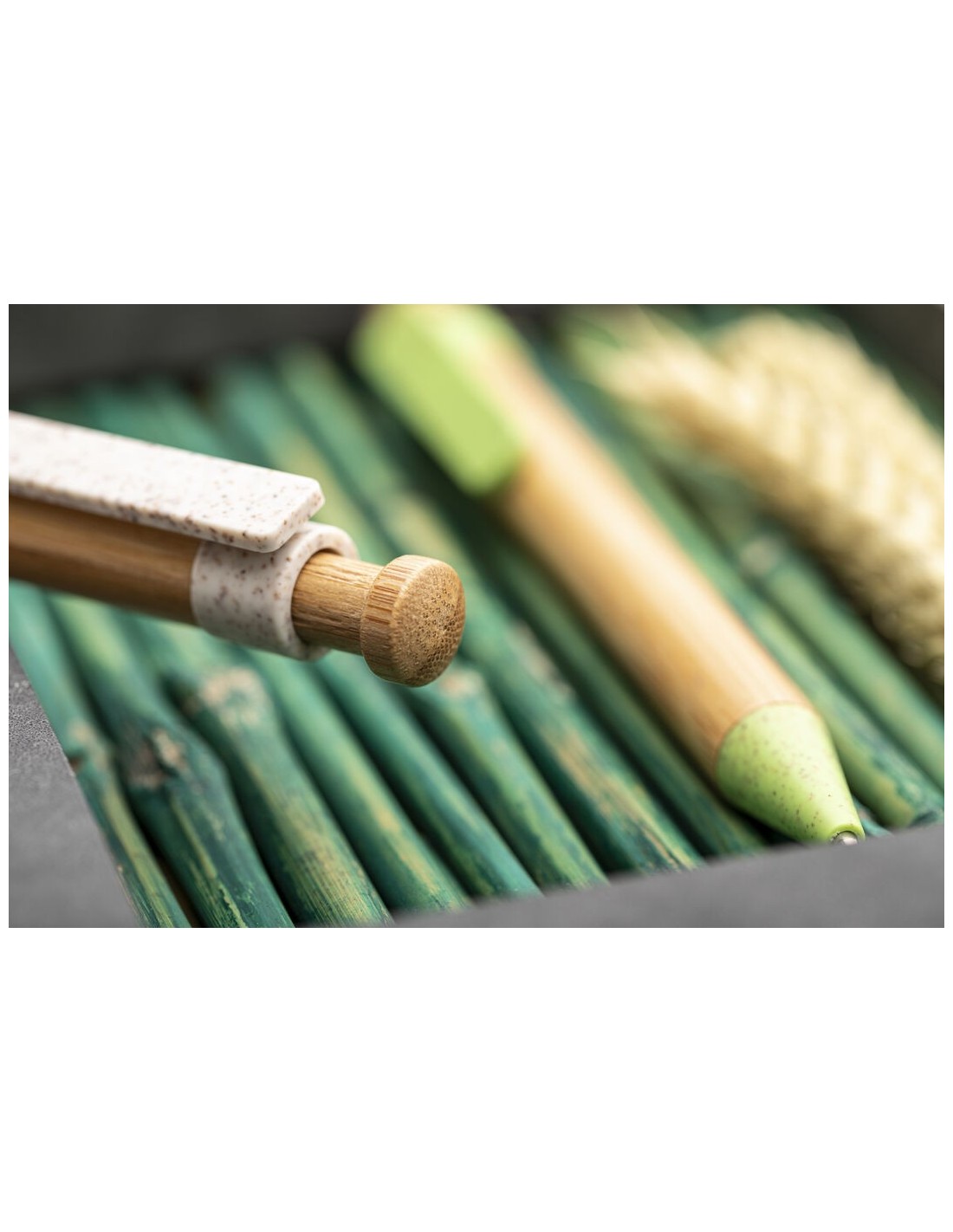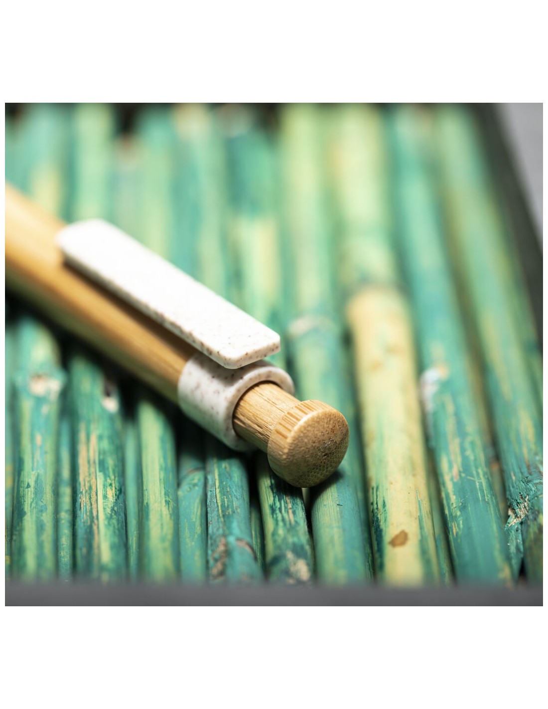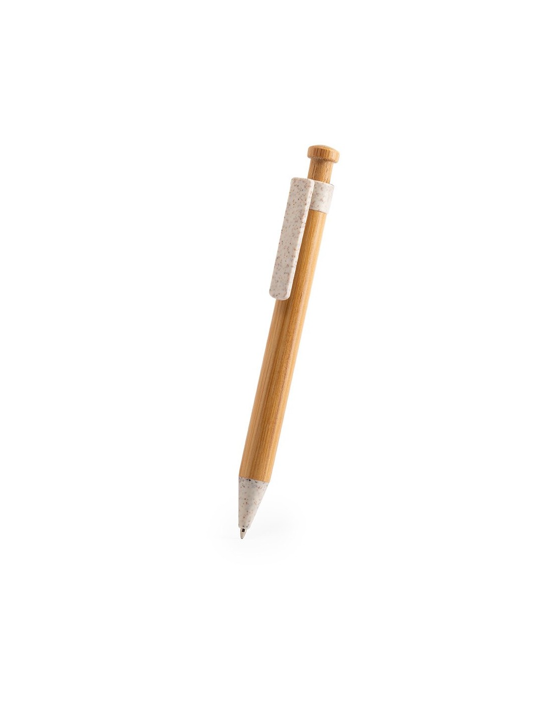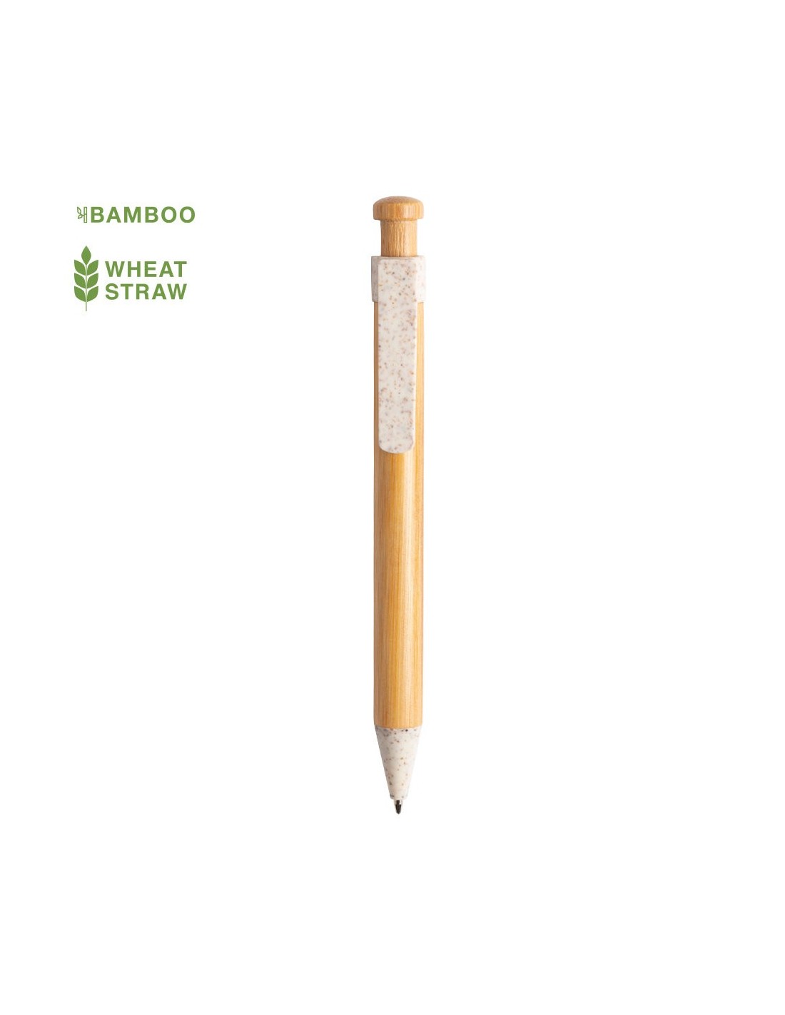 Bolígrafo de línea nature con cuerpo y pulsador biselado en madera de bambú. Clip y punta en caña de trigo, para así fomentar la utilización de materias primas naturales y reducir las emisiones contaminantes. De mecanismo pulsador y con tinta azul. Disponible en colores nature.
