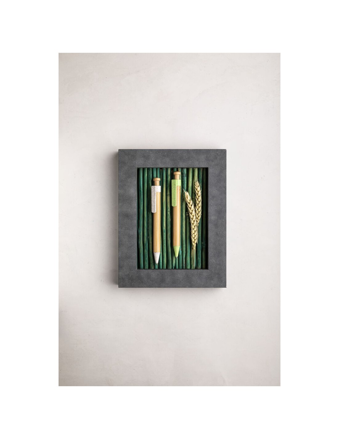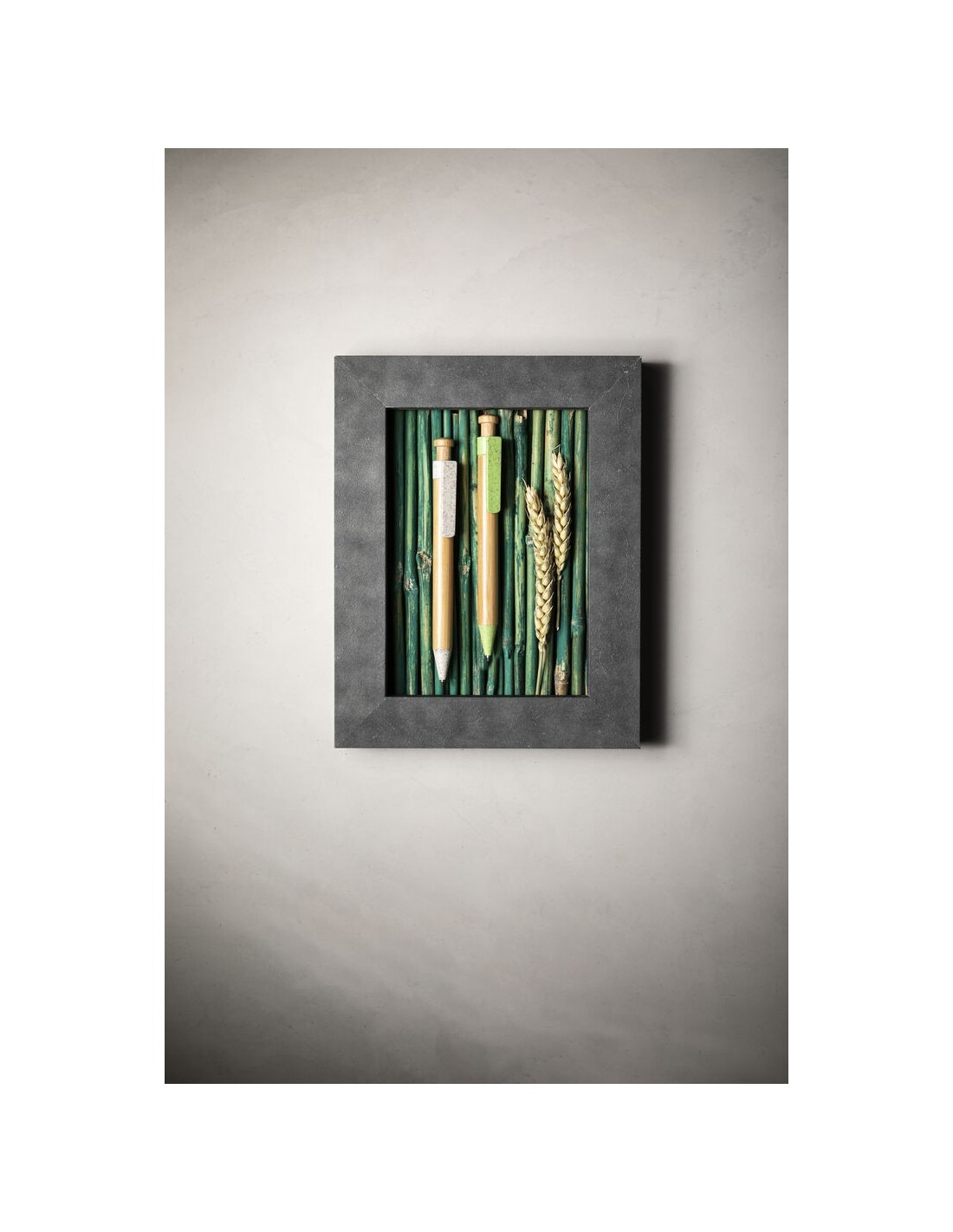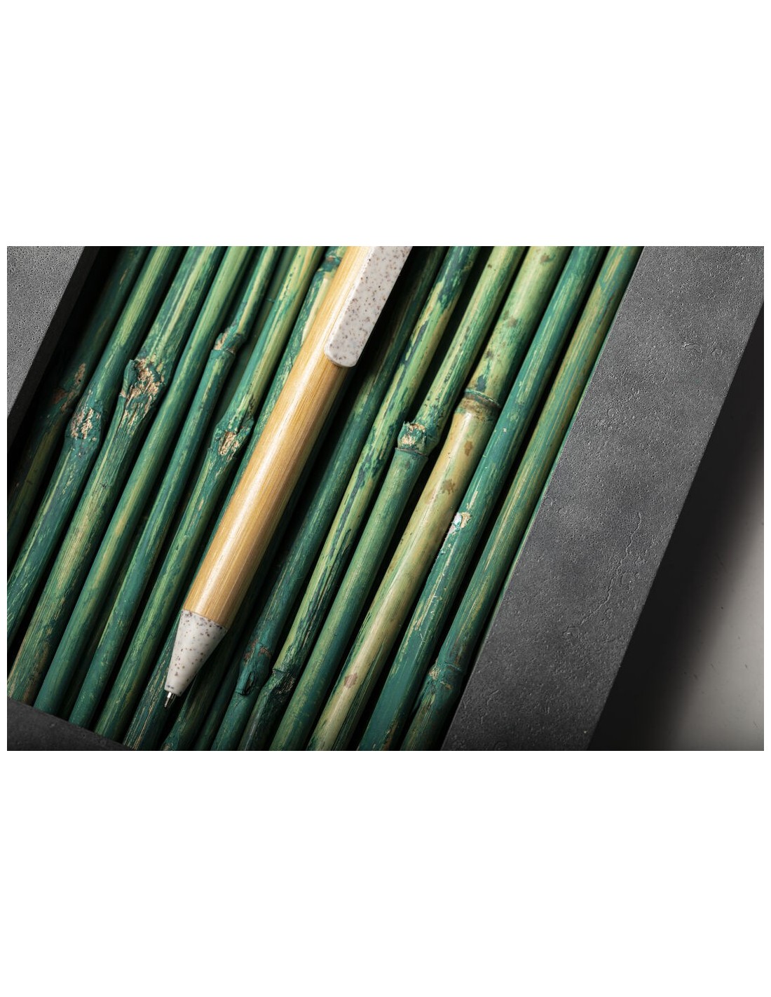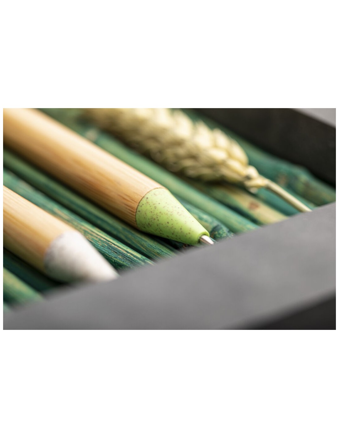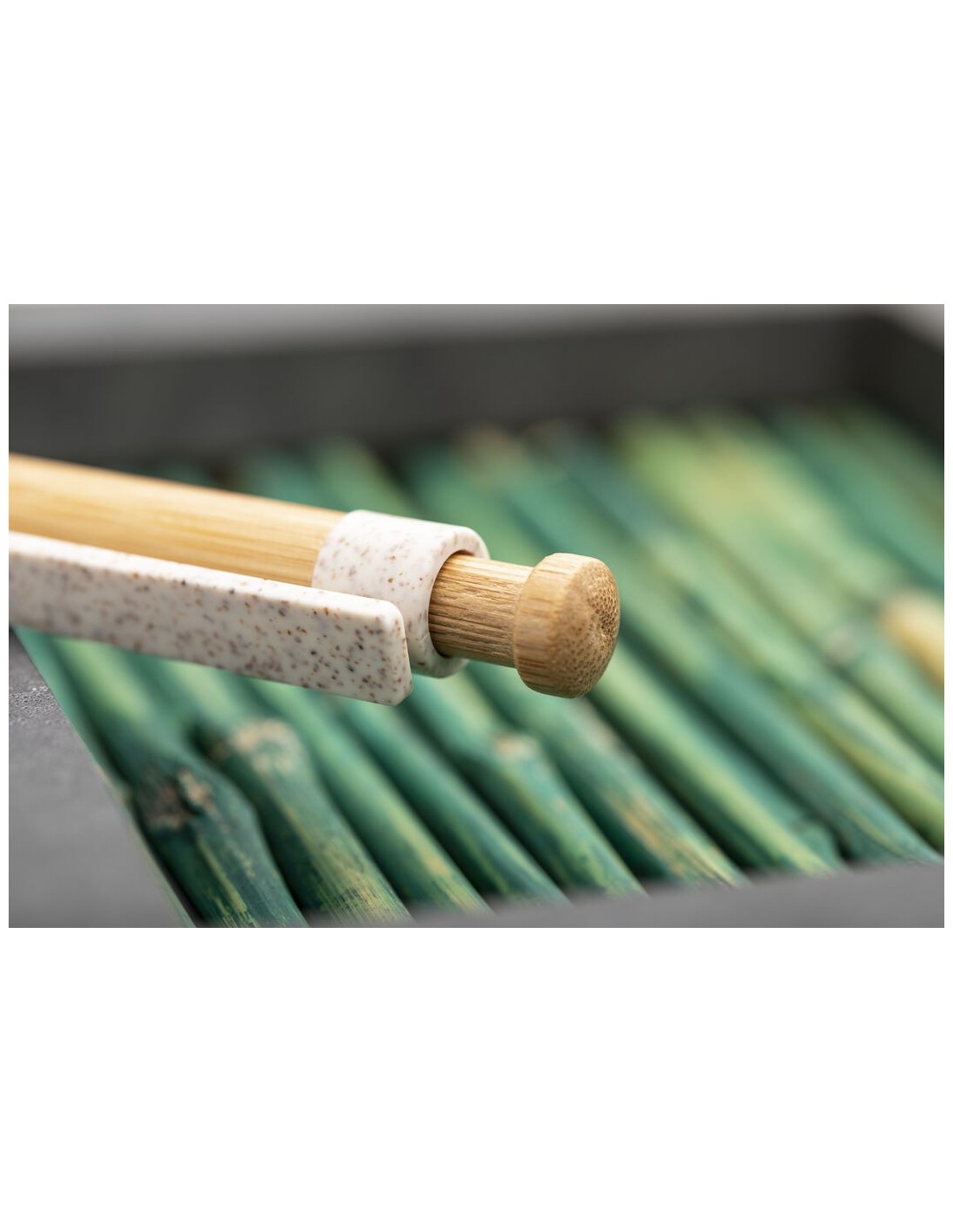 Bolígrafo de línea nature con cuerpo y pulsador biselado en madera de bambú. Clip y punta en caña de trigo, para así fomentar la utilización de materias primas naturales y reducir las emisiones contaminantes. De mecanismo pulsador y con tinta azul. Disponible en colores nature.