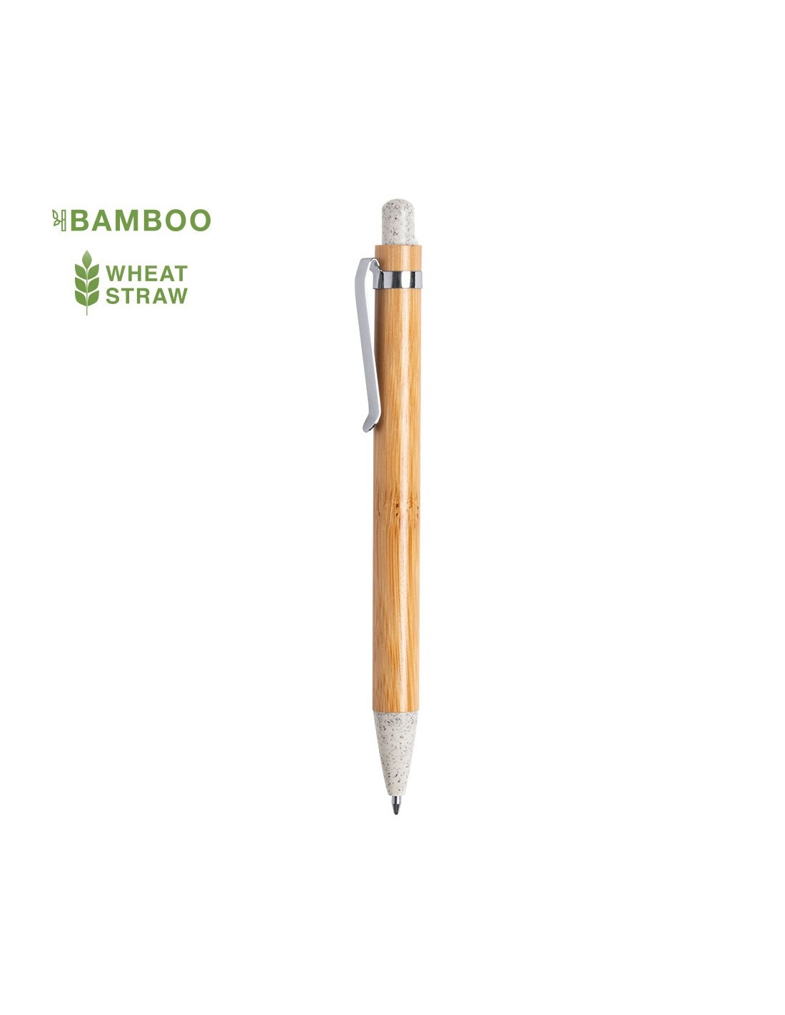 Bolígrafo con mecanismo pulsador de línea nature. Cuerpo en bambú, con pulsador y punta en caña de trigo, para así fomentar la utilización de materias primas naturales y reducir las emisiones contaminantes. Con original clip metálico, de cartucho jumbo y en tinta azul.