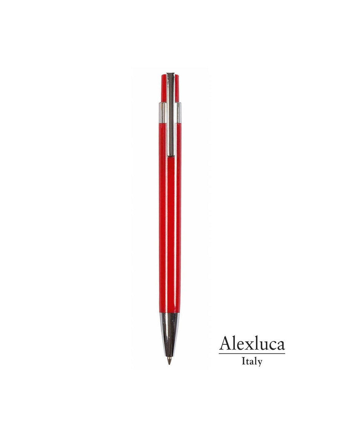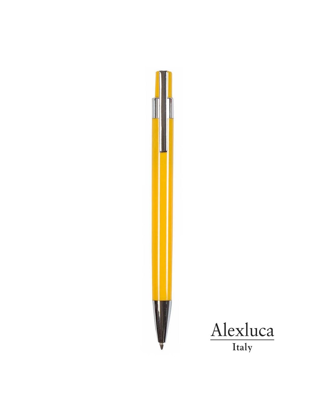 Bolígrafo de Alexluca de mecanismo pulsador de elegante diseño bicolor y suave cuerpo de acabado brillante en llamativos colores sólidos. Con accesorios en acabado plateado brillante y logotipo de la marca en parte superior del pulsador. De cartucho jumbo