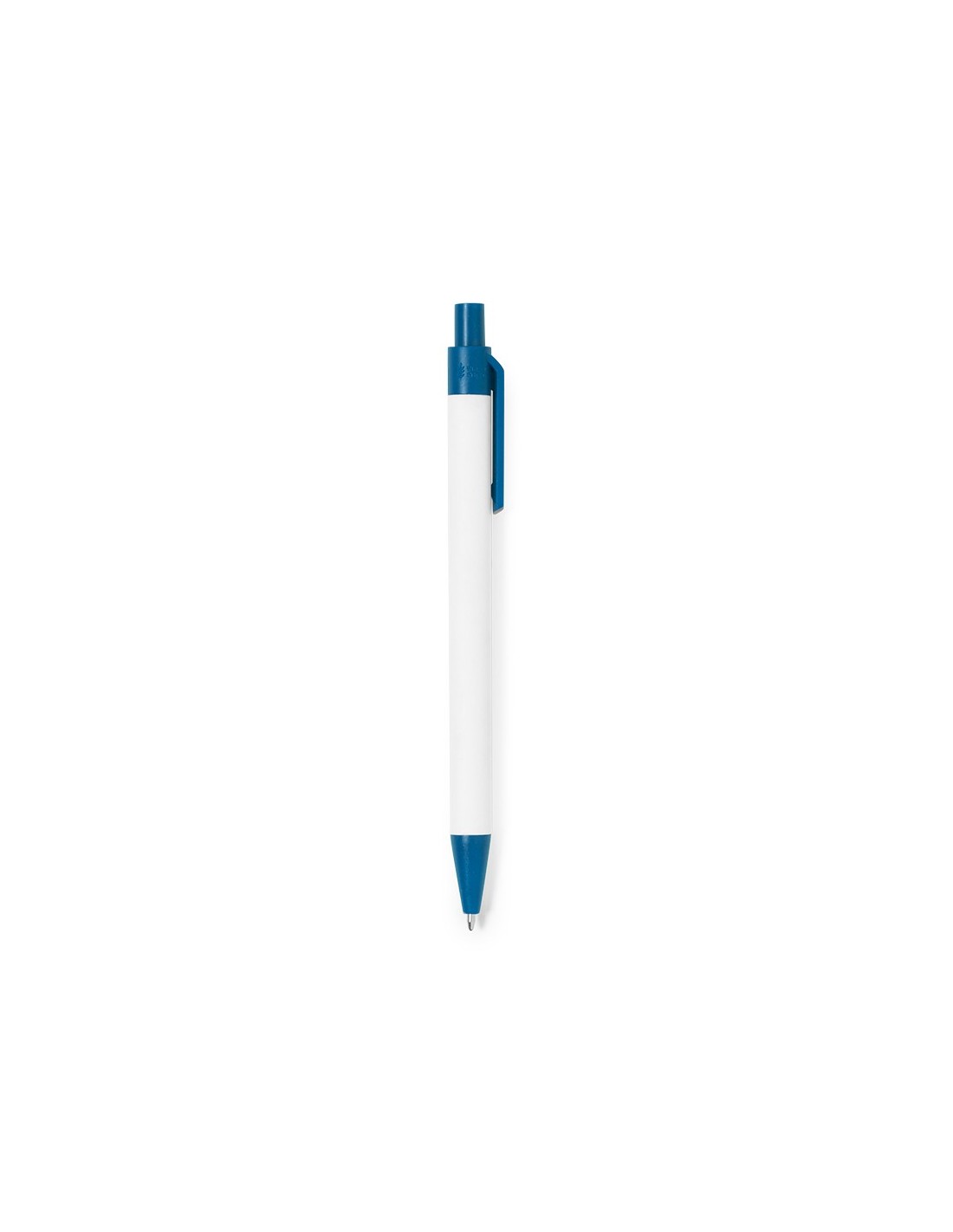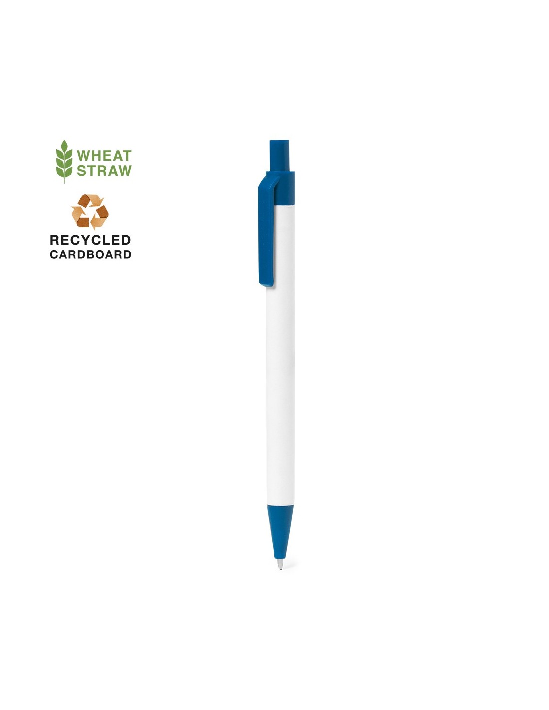 Bolígrafo de mecanismo pulsador con cuerpo en cartón reciclado. Clip, punta y pulsador en caña de trigo. En tinta azul y con distintivo Wheat Straw en la parte superior del bolígrafo. El cartón reciclado proviene del reaprovechamiento de excedente de fabricaciones y reciclaje de papel en el final de su vida útil, convirtiéndose en un lienzo ecológico y sostenible. La caña de trigo fomenta la utilización de materias primas naturales, reduciendo así las emisiones contaminantes.
